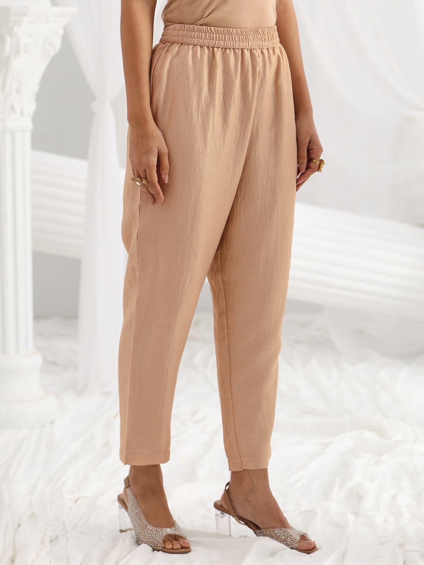 Our 3-piece beige silk blend Anarkali kurta set features a V-neckline, regular sleeves, and a statement yoke. Complemented with straight pants with a partially elasticated waistband and 2 pockets, and a printed dupatta. Adorned with floral zari embroidered, this style is perfect for festive occasions.