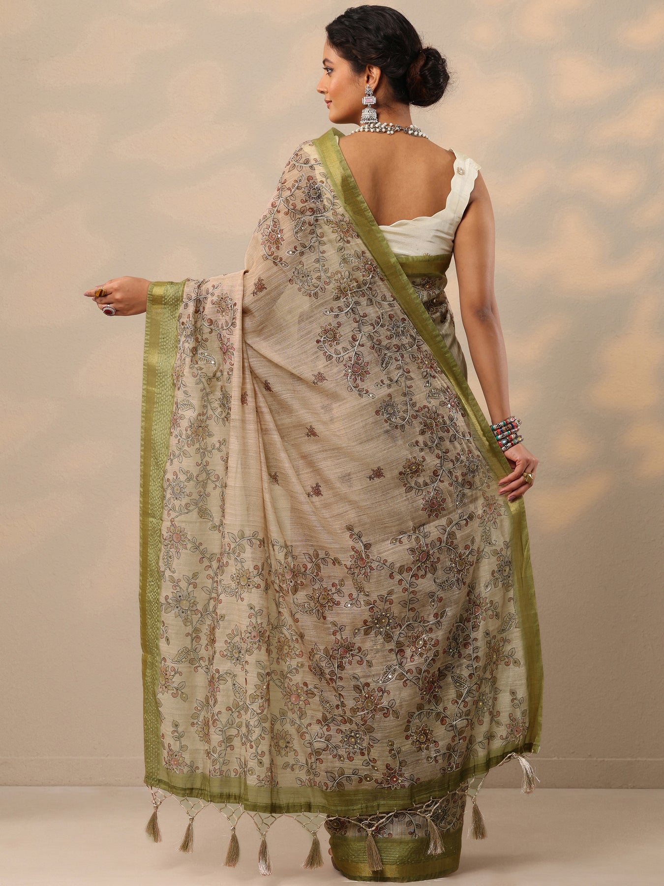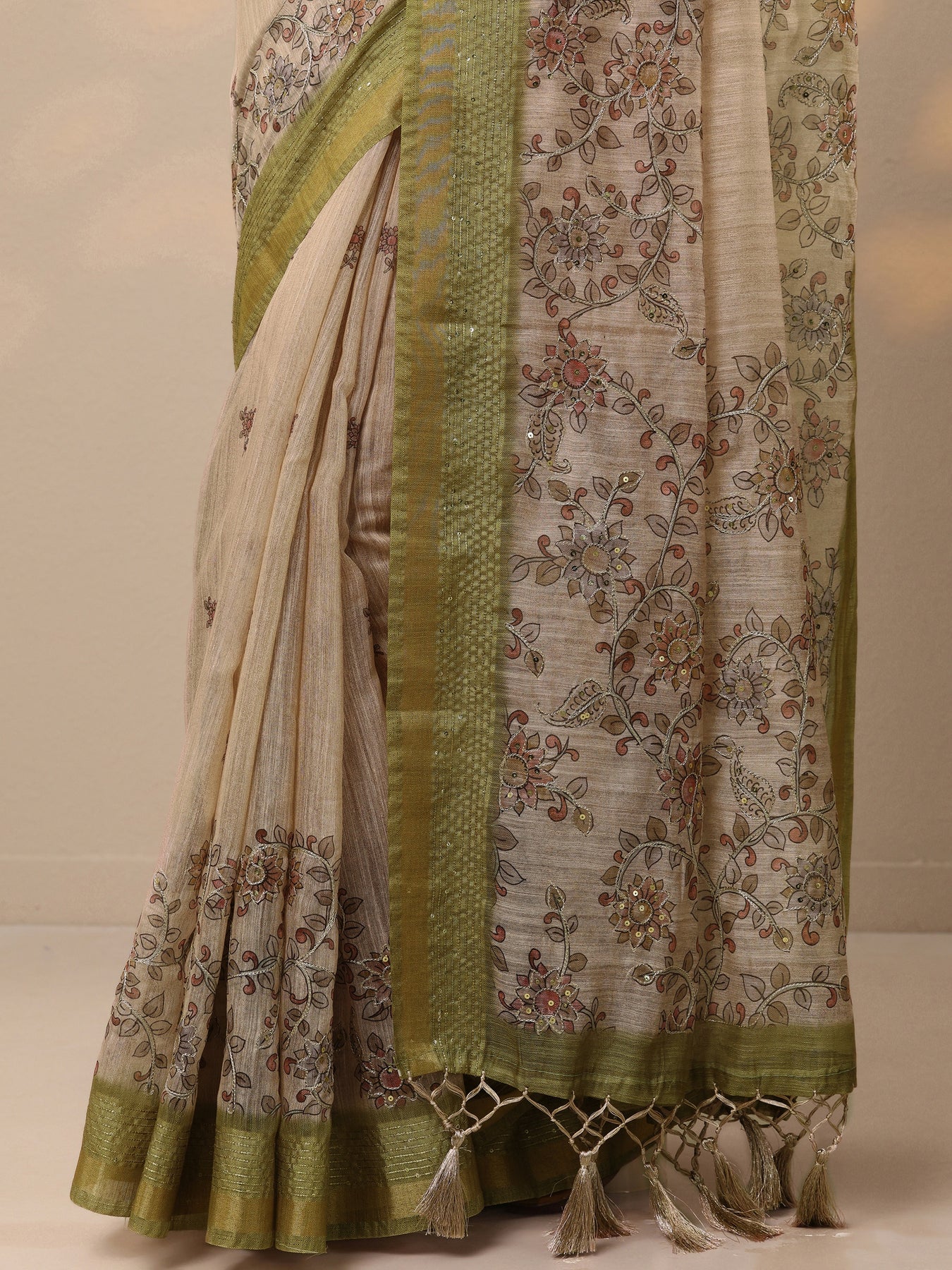 Beige Printed Cotton Blend Saree With Unstitched Blouse Piece