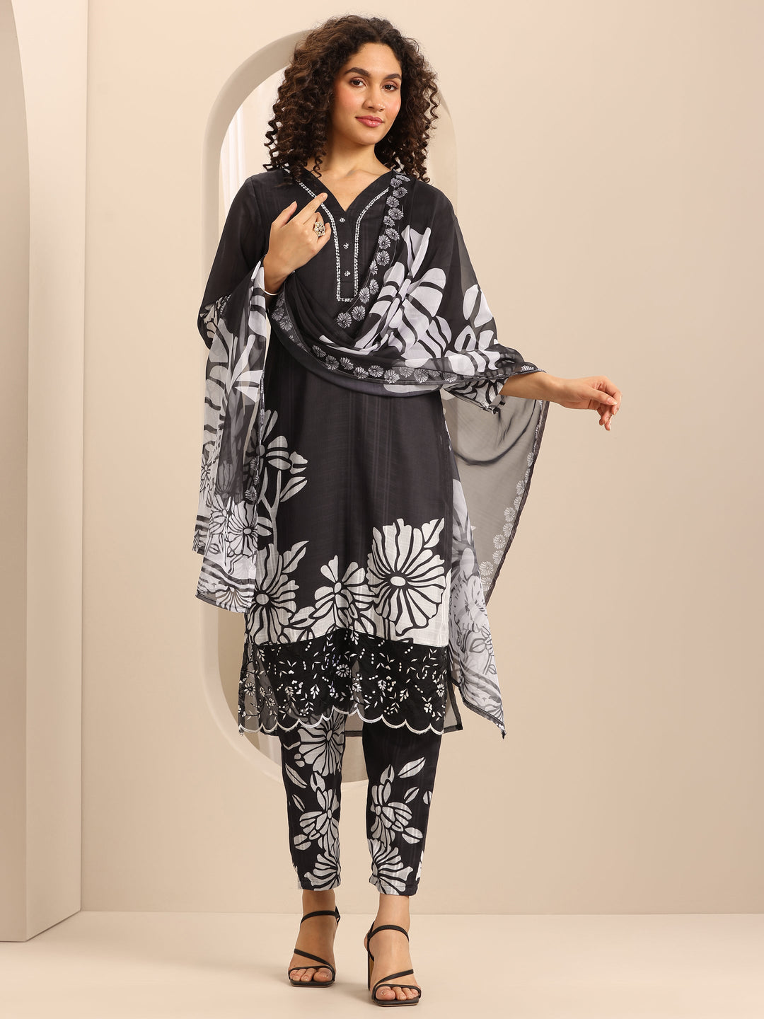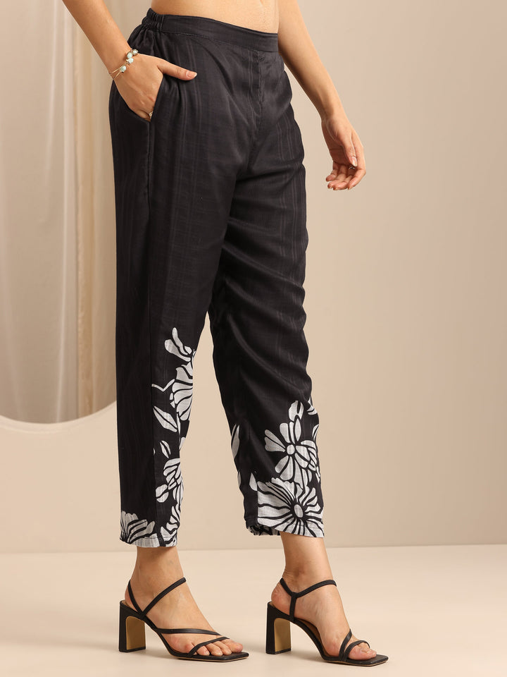Black Printed Cotton Blend Straight Suit Set With Dupatta