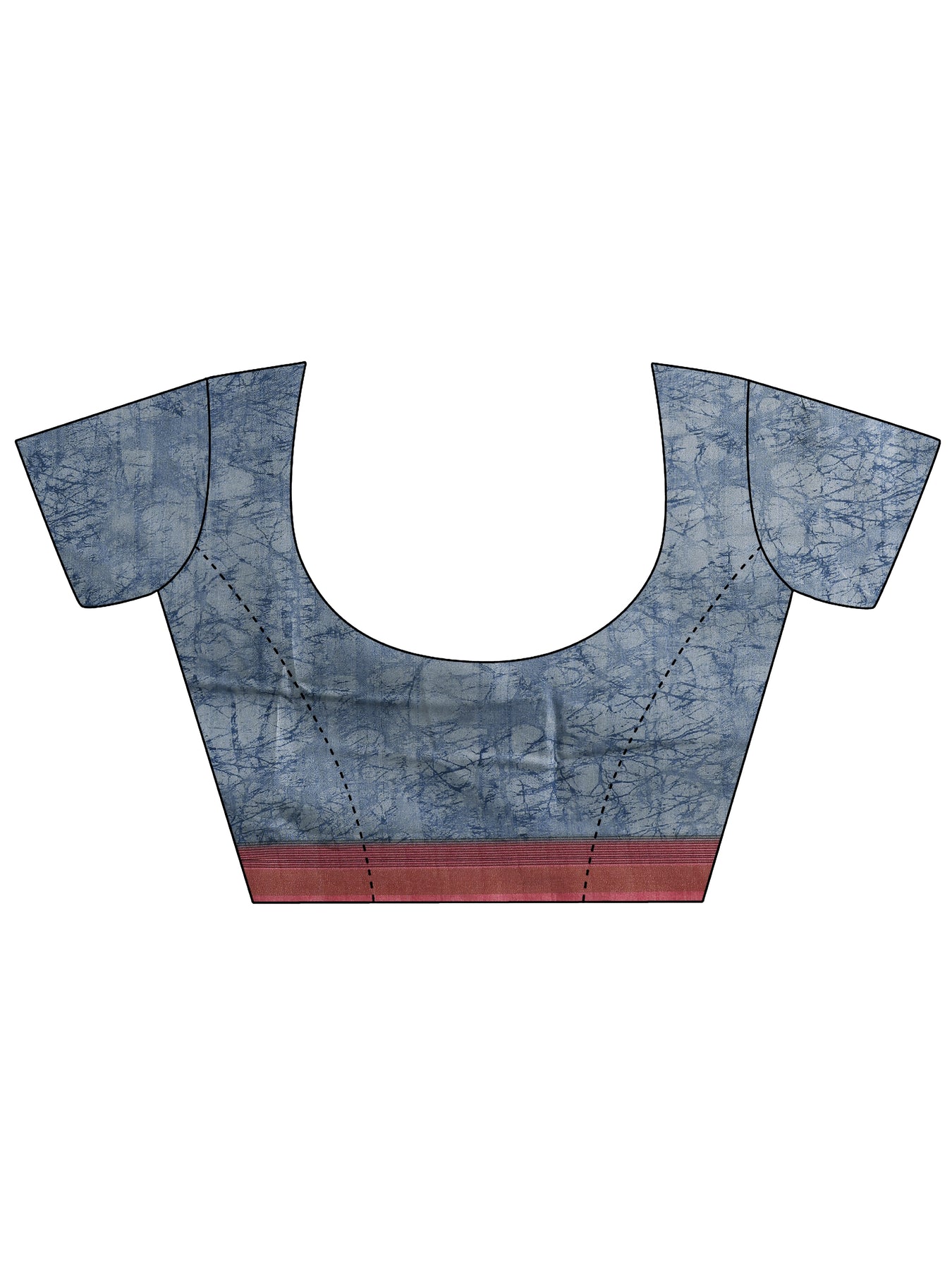 Blue Block Printed Silk blend Saree With Unstitched Blouse Piece
