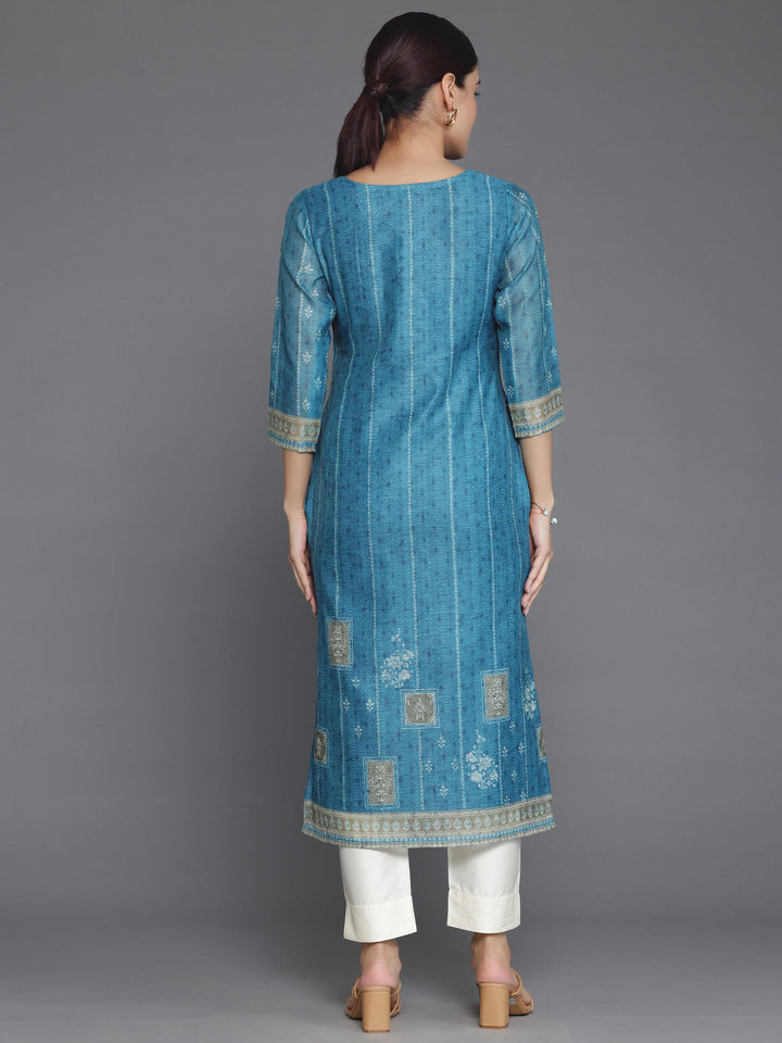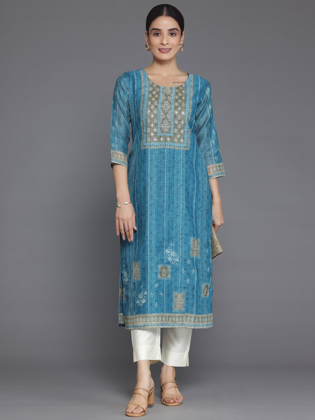 Our blue printed Chanderi silk kurta features a straight-fit kurta with a round neckline, three-quarter sleeves, and a statement yoke. Elevated with intricate thread work, this style is perfect for casual outings.