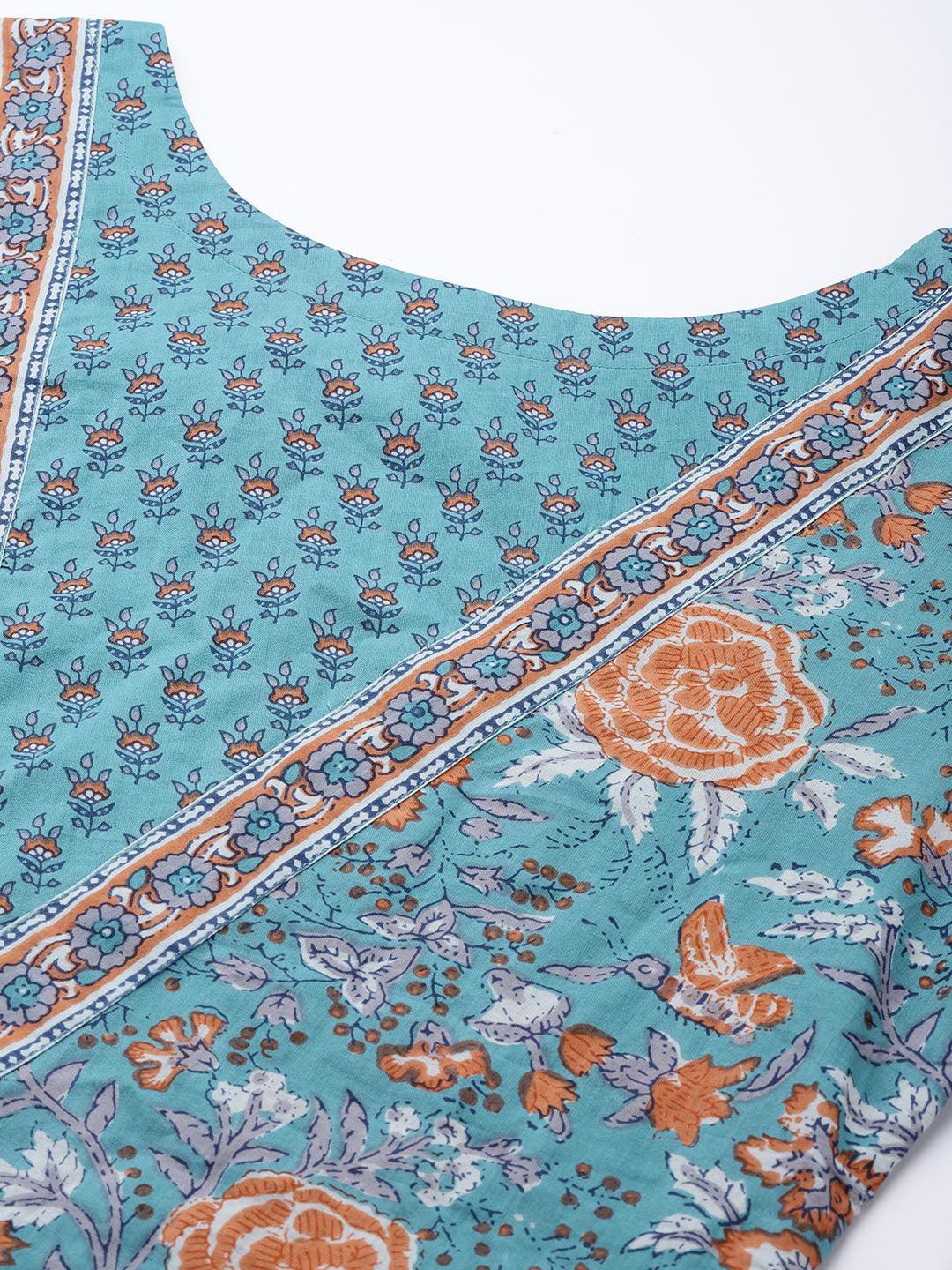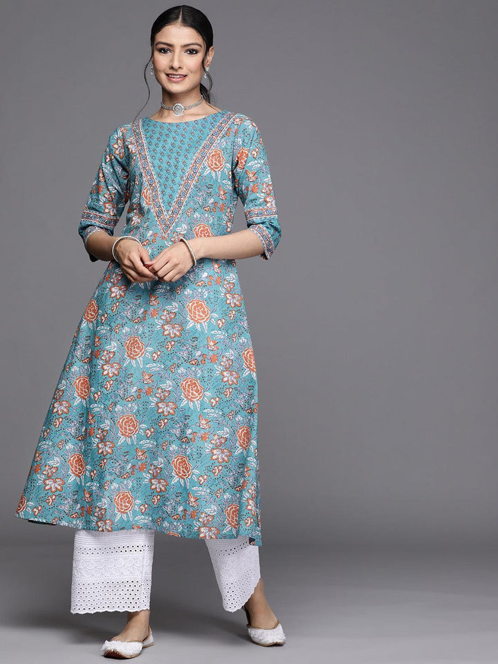 Our blue floral print A-line cotton kurta features a round neckline, three-quarter sleeves and roomy pockets. Adorned with complementing fabric-trim accents, this refreshing style is perfect for work and beyond.