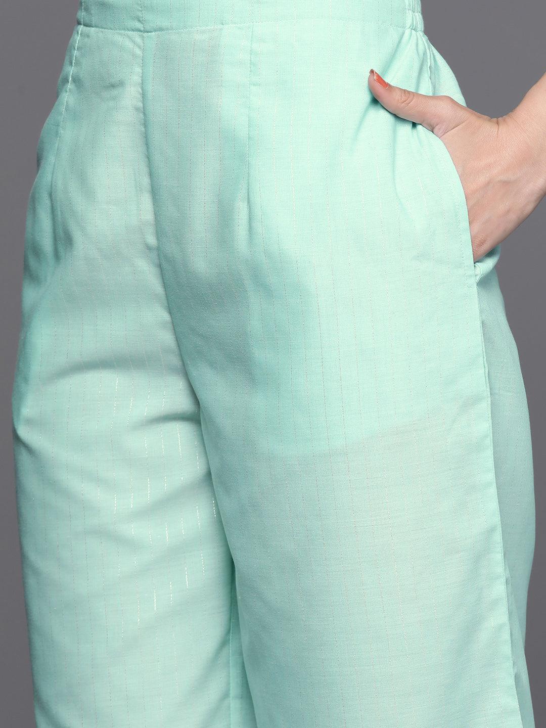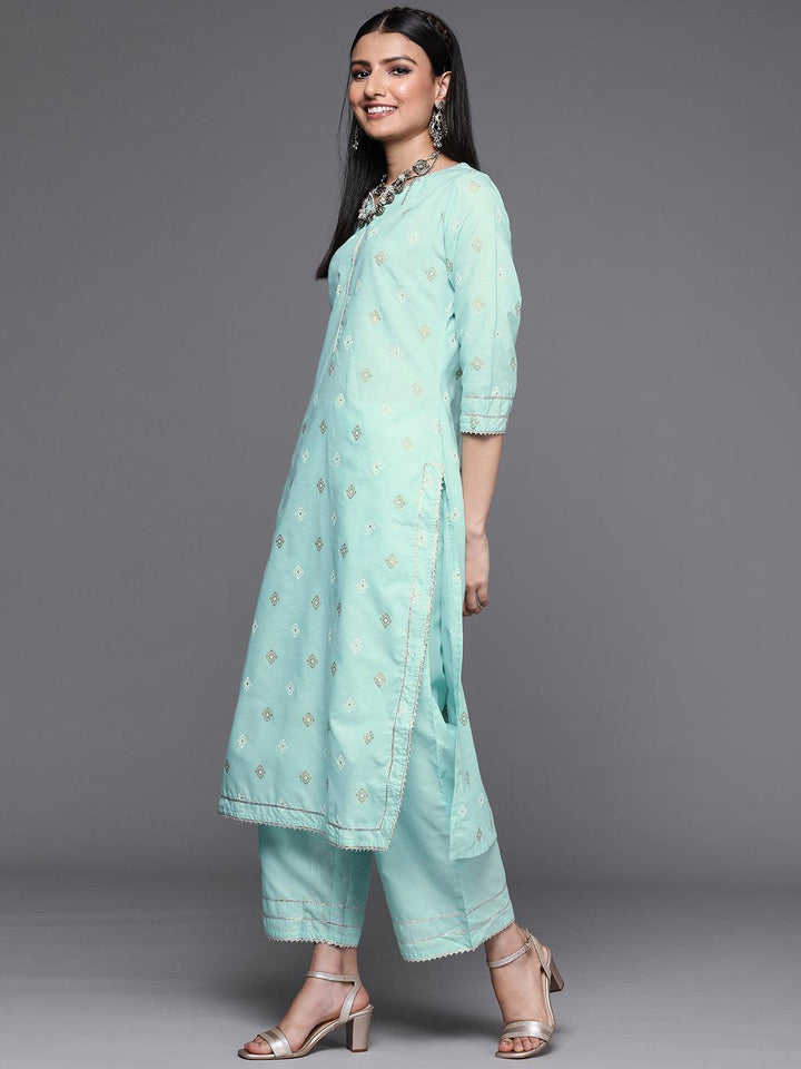 Our 3-piece blue printed cotton suit set features a straight-fit geometric print kurta with a notched neckline and three-quarter sleeves, straight palazzo pants with a partially elasticated waistband and roomy pockets, and a complementing dupatta in a solid tone. Adorned with delicate Gota Patti accents, this elegant style is ideal for light festive occasions.