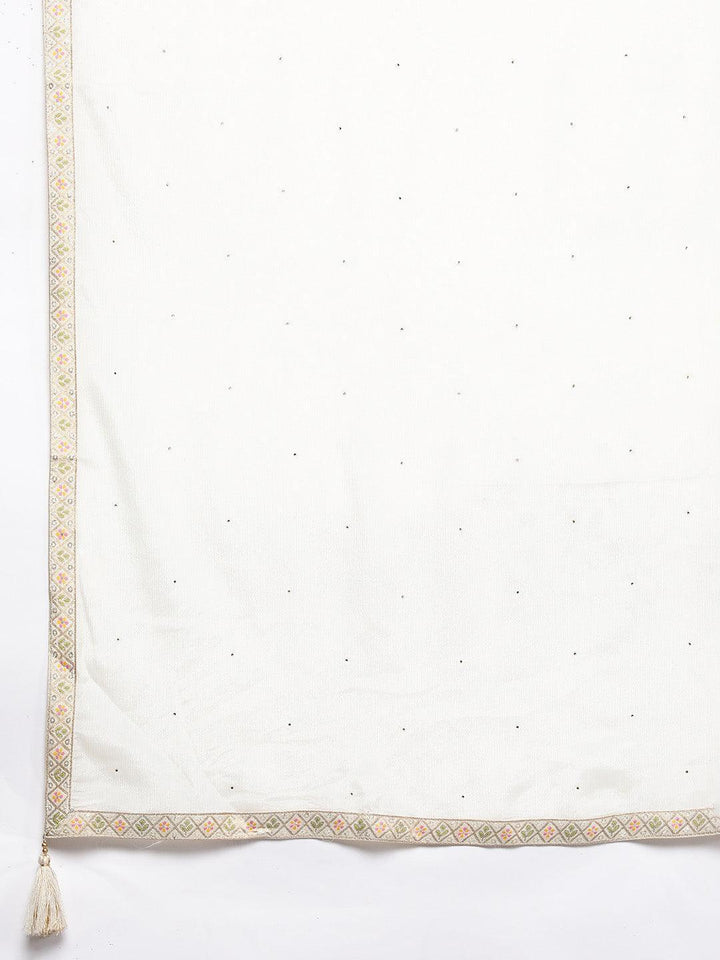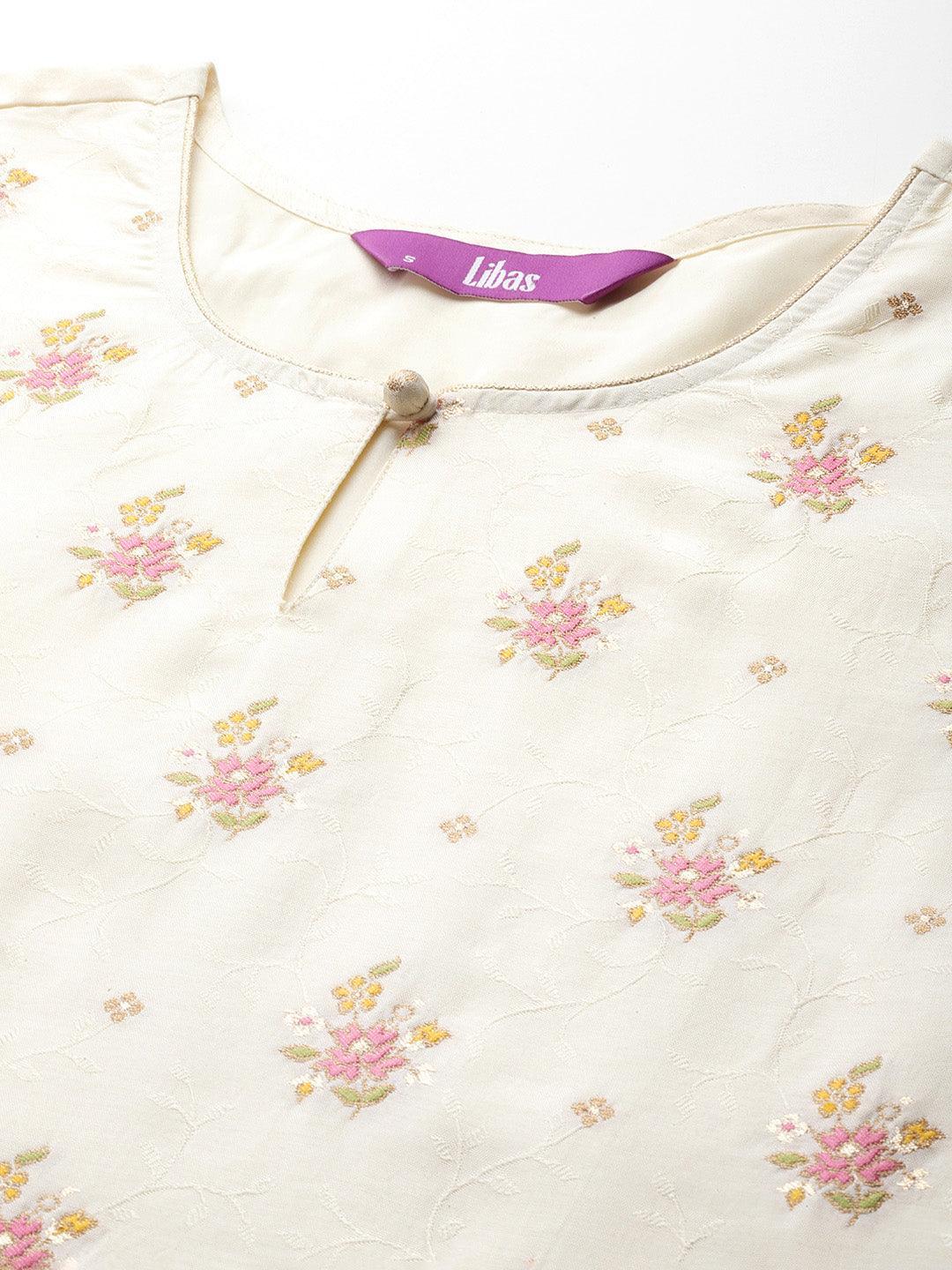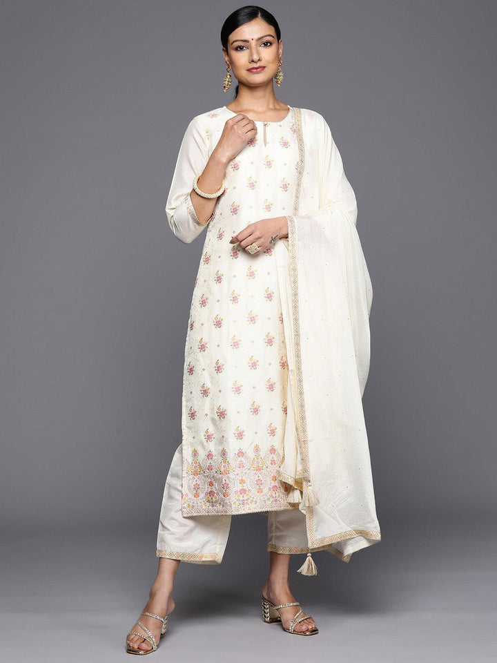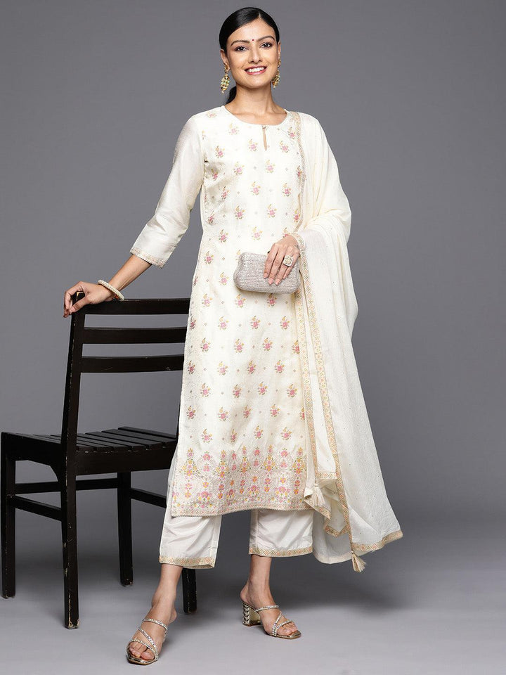 Cream Woven Design Silk Blend Straight Kurta With Trousers & Dupatta - Libas