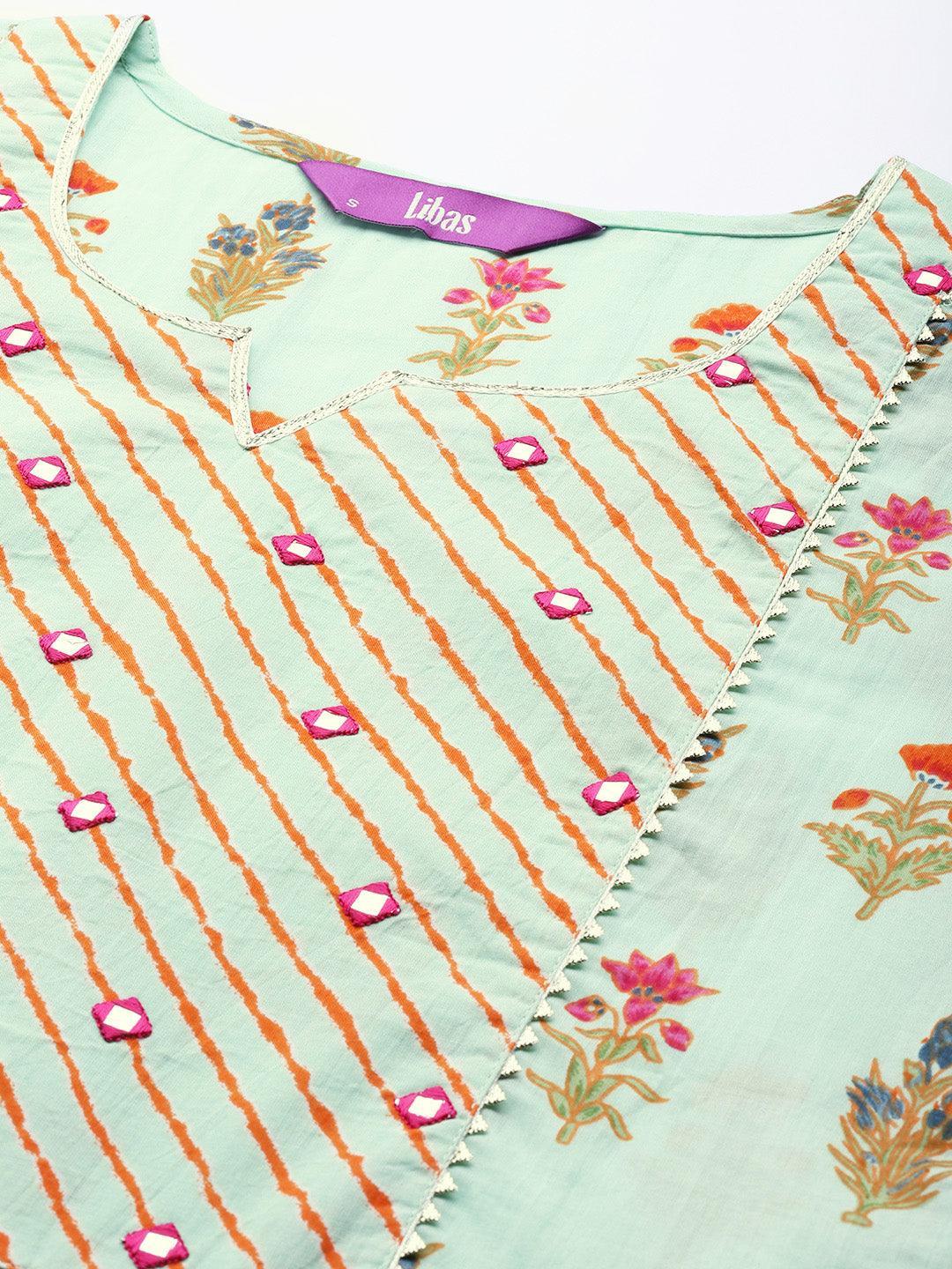 Our green straight-fit floral print cotton kurta features a notched neckline, a statement yoke and handcrafted side tassels details. Adorned with elegant mirror-work and delicate Gota Patti accents, this refreshing style is perfect for weekend brunches.
