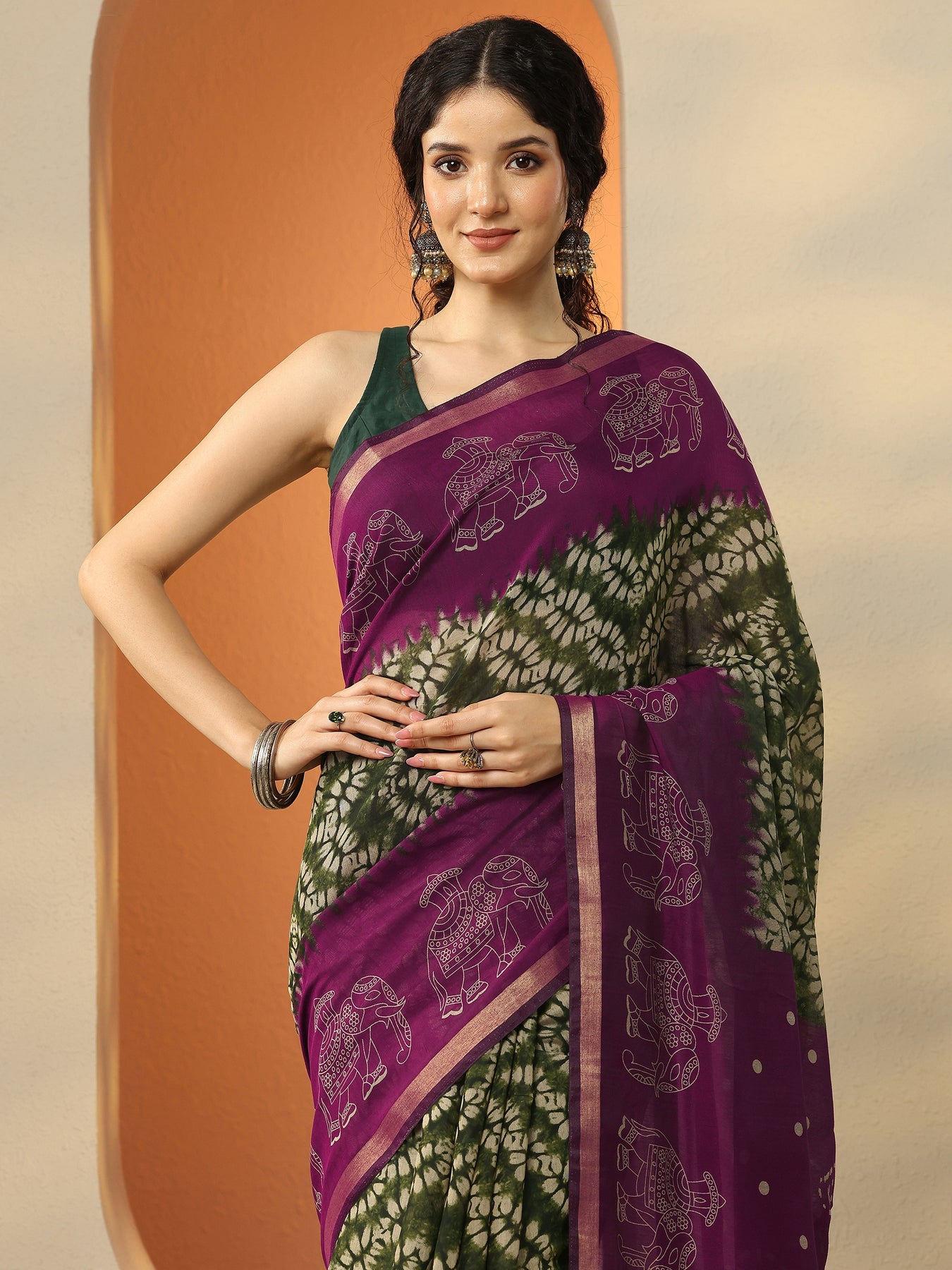 Green Printed Silk Blend Saree With Unstitched Blouse Piece