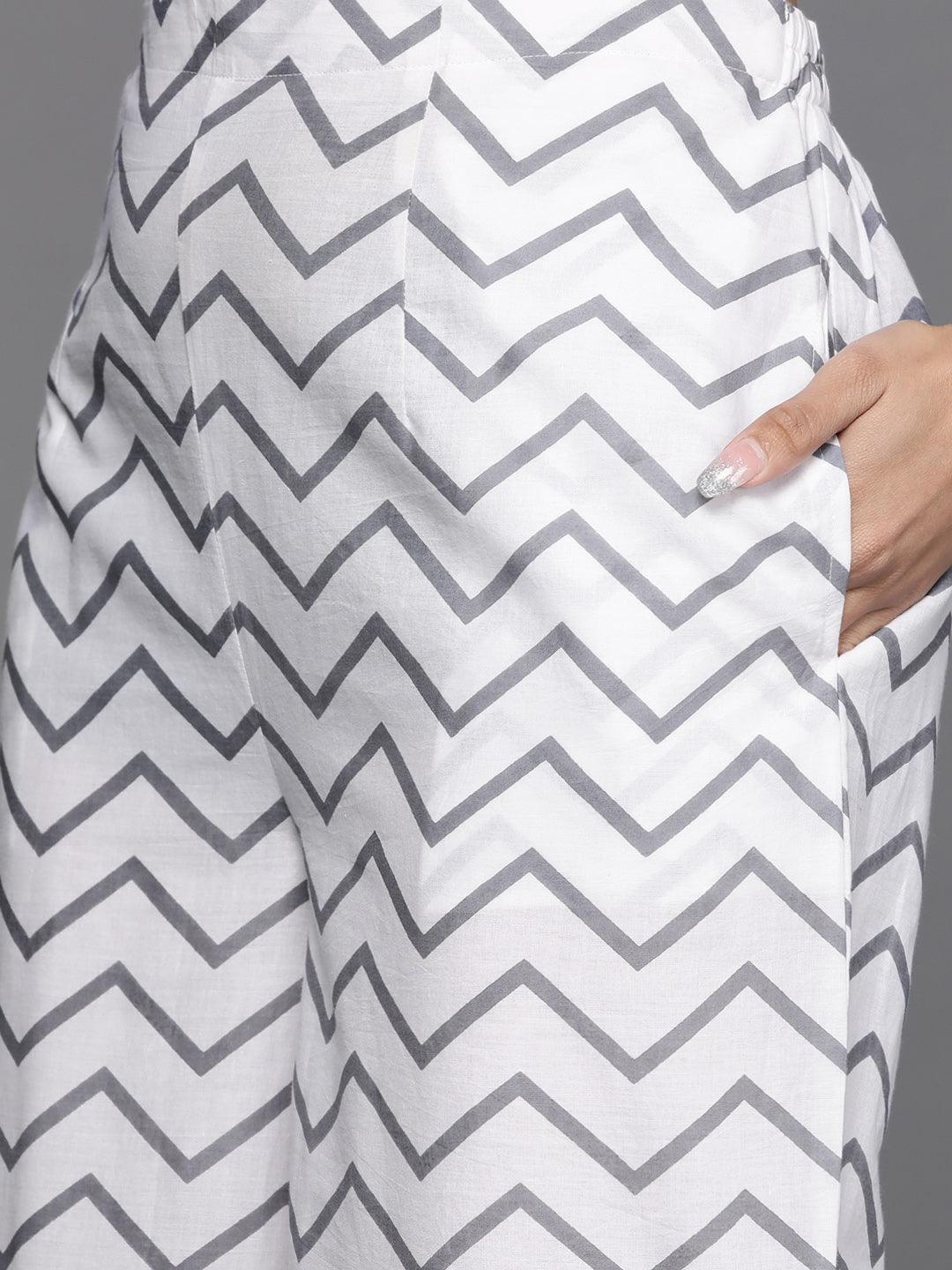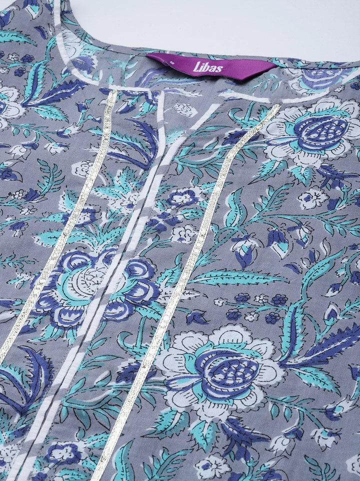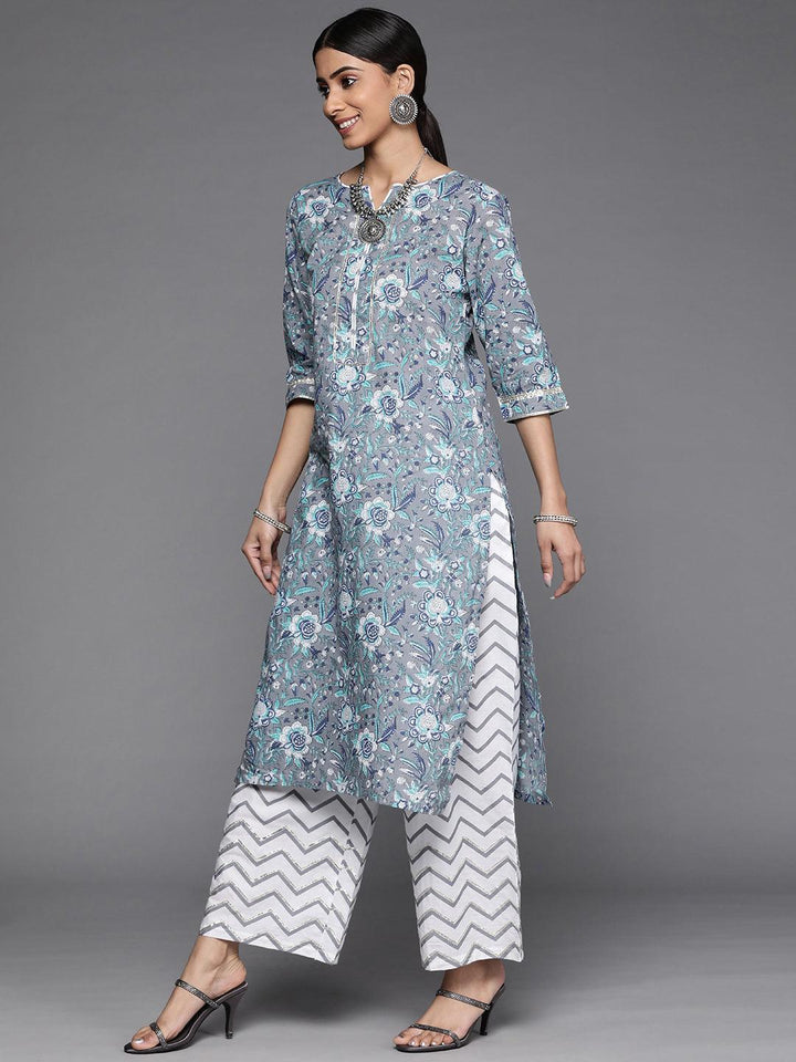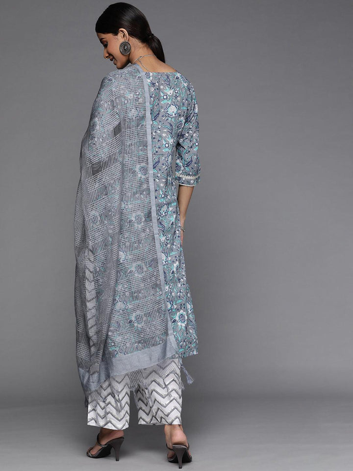 Our 3-piece grey printed cotton suit set features a floral print straight-fit, notched neckline kurta with Gota Patti accents on the yoke and sleeves, straight palazzo pants with a partially elasticated waistband and roomy pockets, and a contrasting woven textured dupatta in a luxurious feel, organza fabric. Perfect for effortless everyday wear.