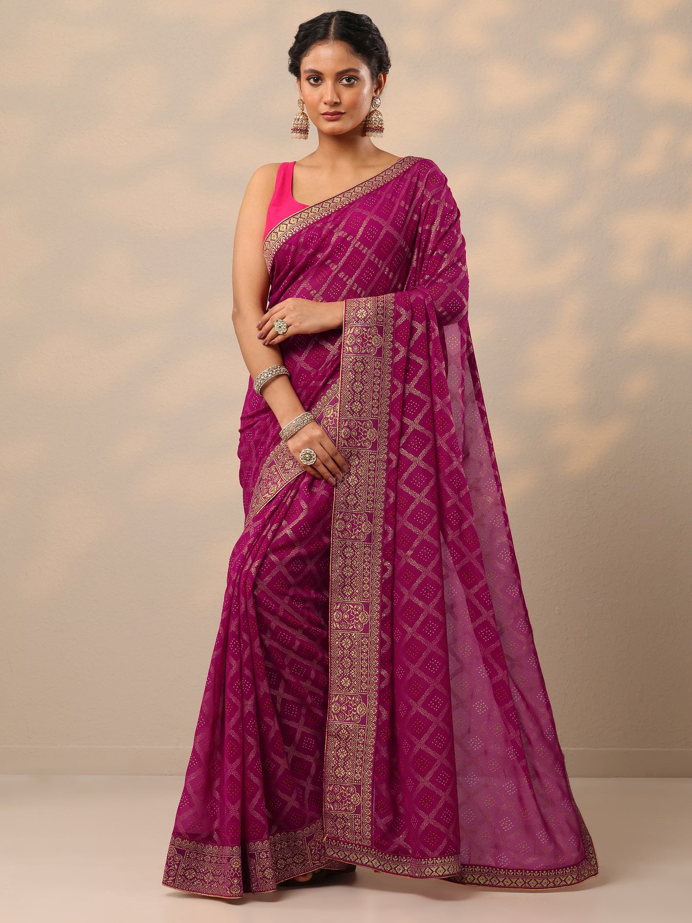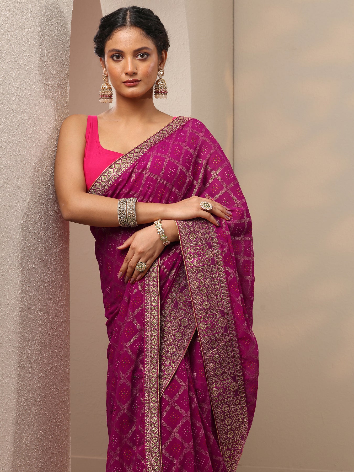 Magenta Bandhani Printed Georgette Saree With Unstitched Blouse Piece