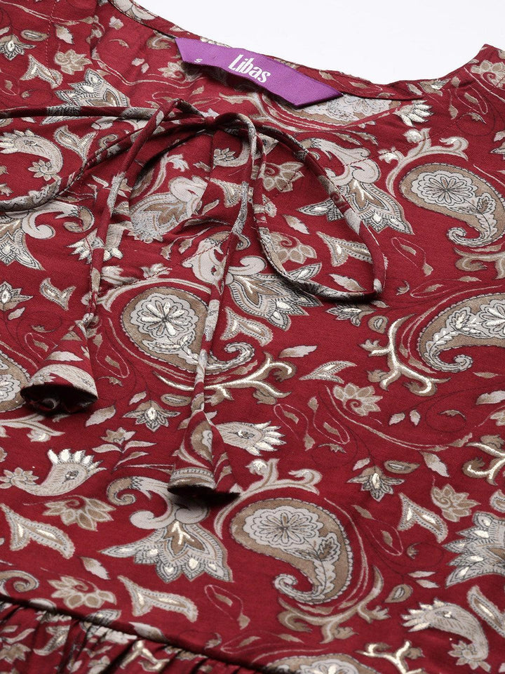 Our maroon red floral print fit and flare silk dress features a keyhole neckline with delicate handcrafted dori detailing, three-quarter sleeves, and roomy pockets. Elevated with a flounce hemline, this charming style is perfect for light festivities.