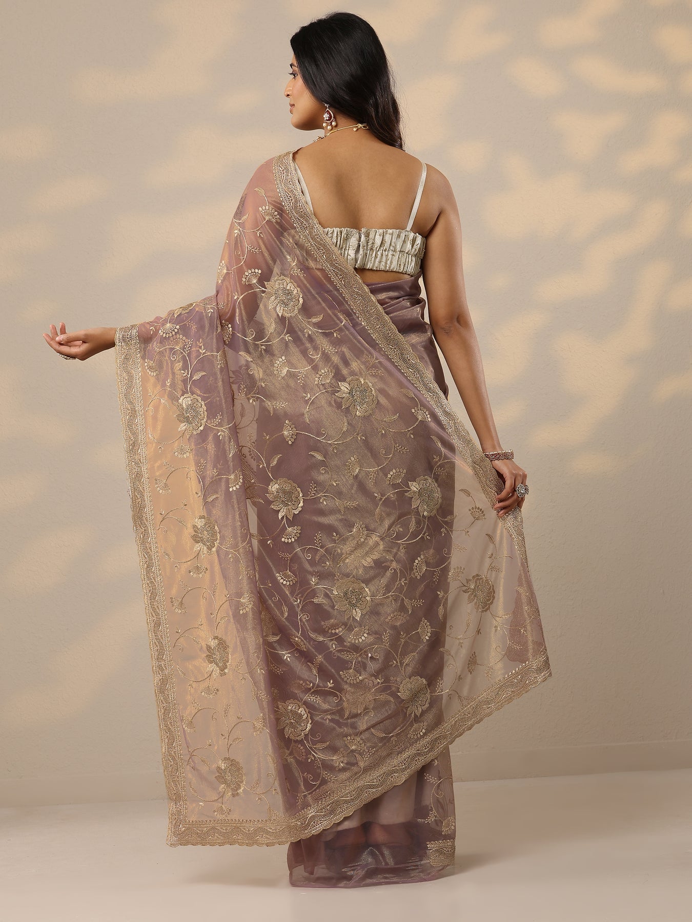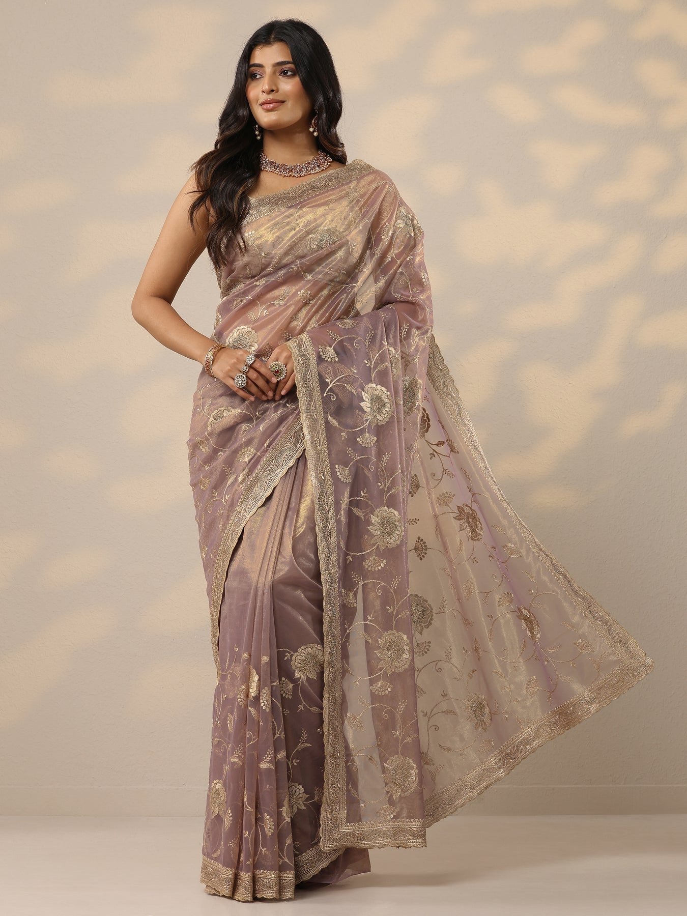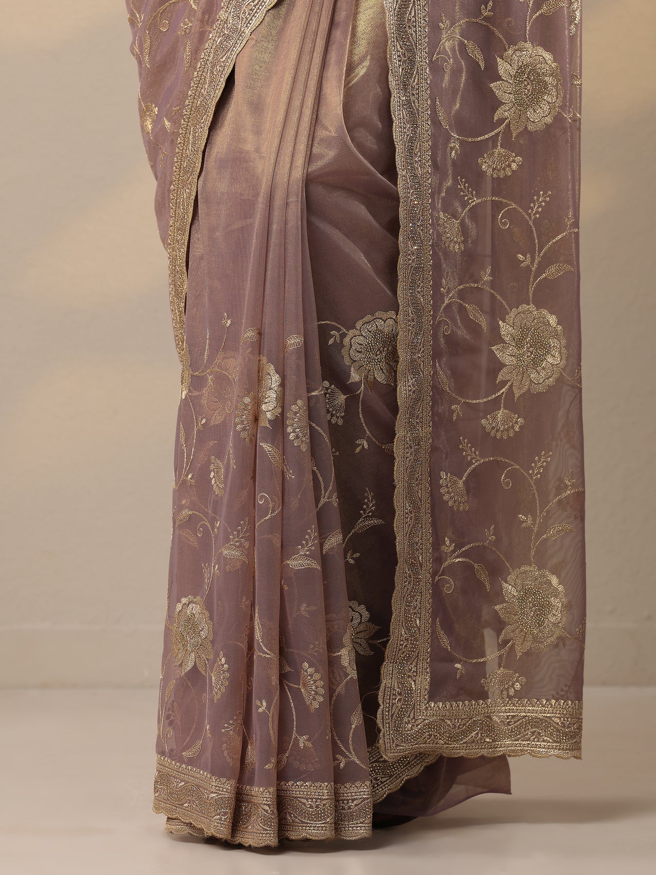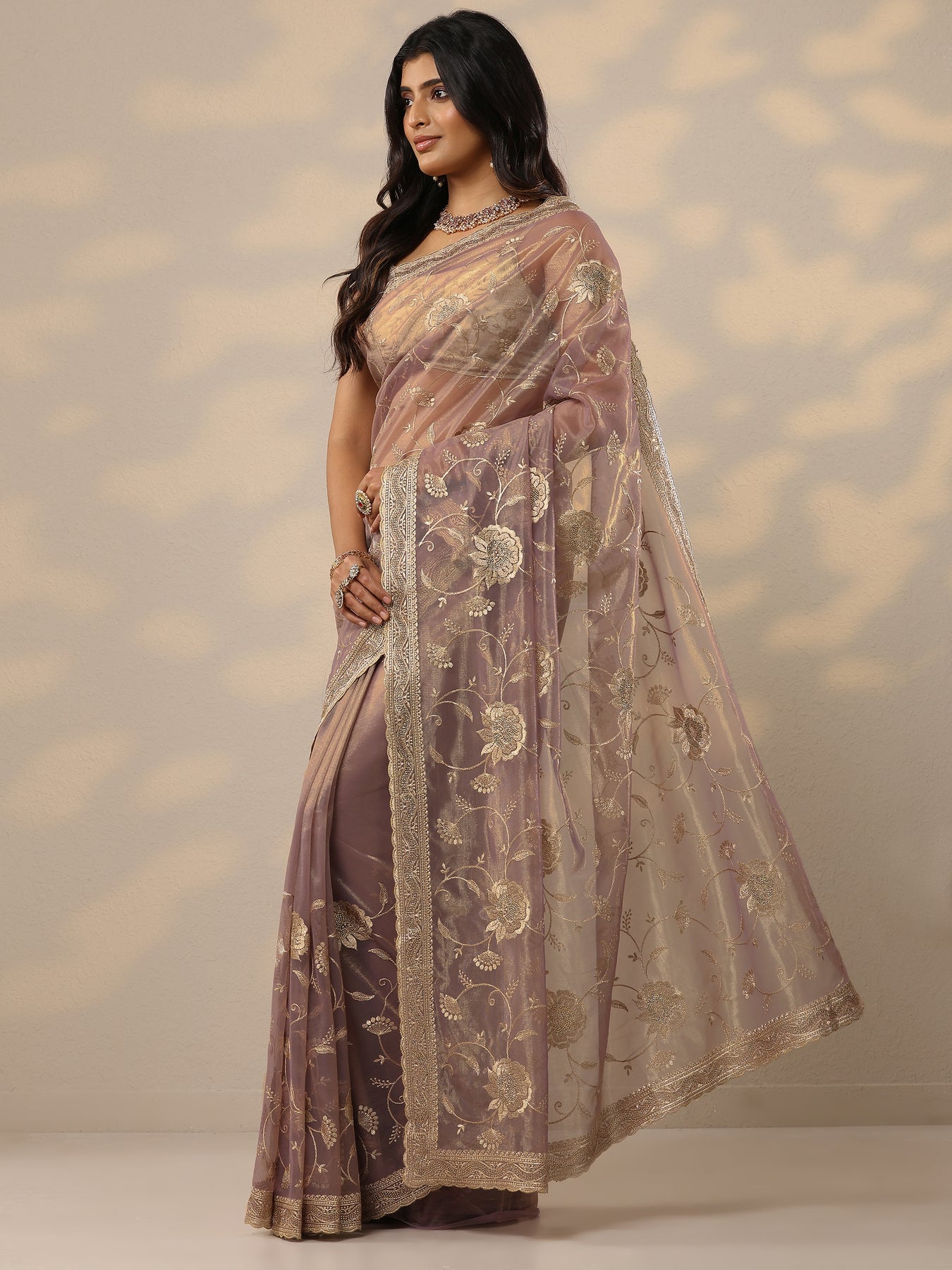 Mauve Embroidered Nylon Sarees With Unstitched Blouse Piece