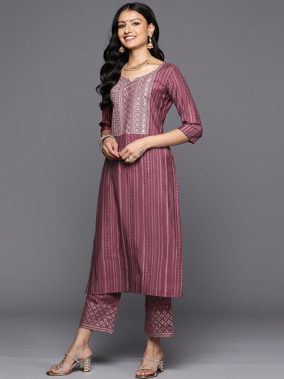Our 3-piece mauve silk blend suit set features a straight-fit kurta with a notched neckline, three-quarter sleeves, and a statement yoke. Complemented with embellished trousers with a partially elasticated waistband and roomy pockets, and a poly chiffon dupatta. Adorned with intricate thread work, sequins detailing, and Gota Patti, this style is perfect for casual outings.
