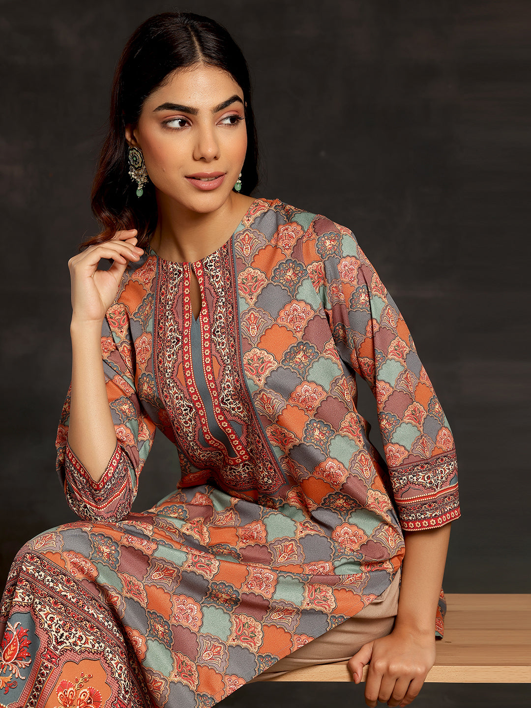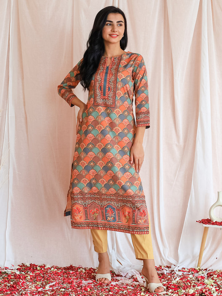 Our brown printed straight-fit kurta, crafted in crepe fabric, features a keyhole neckline and three-quarter sleeves. Elevated with captivating ethnic motifs prints, this style is perfect for casual outings.
