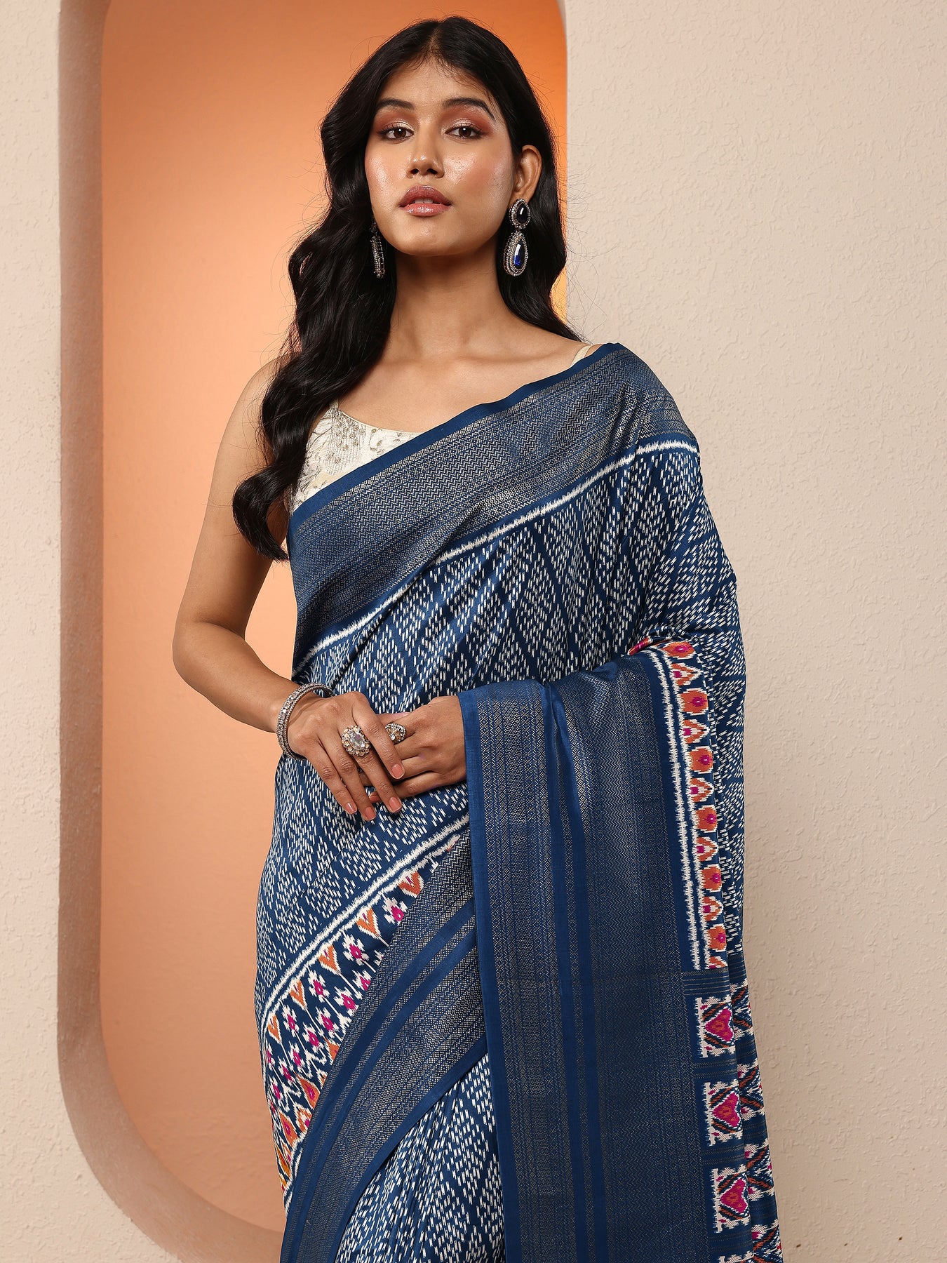 Navy Blue Geometric Printed Silk Blend Saree With Unstitched Blouse Pi