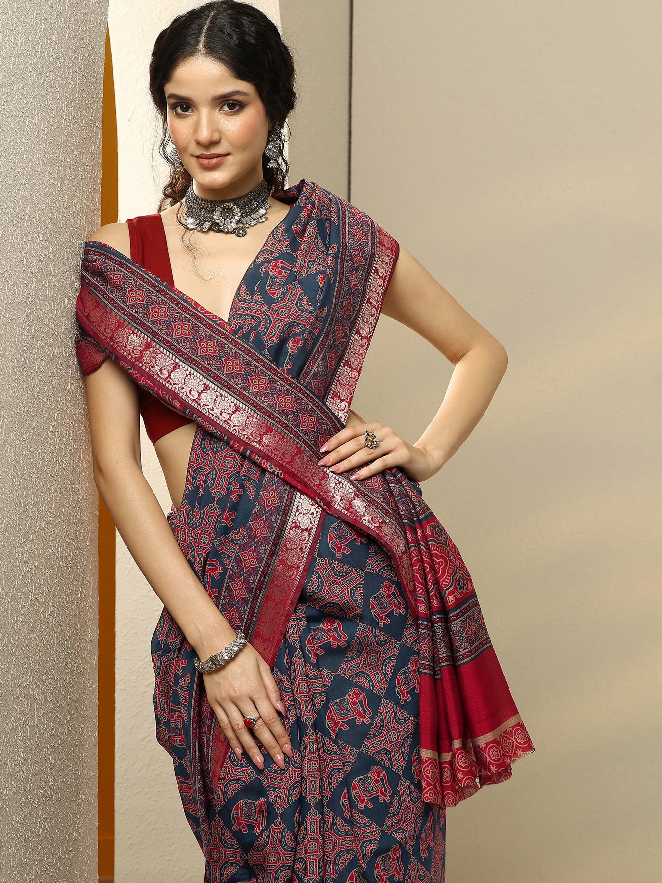 Navy Blue Printed Silk Blend Saree With Unstitched Blouse Piece