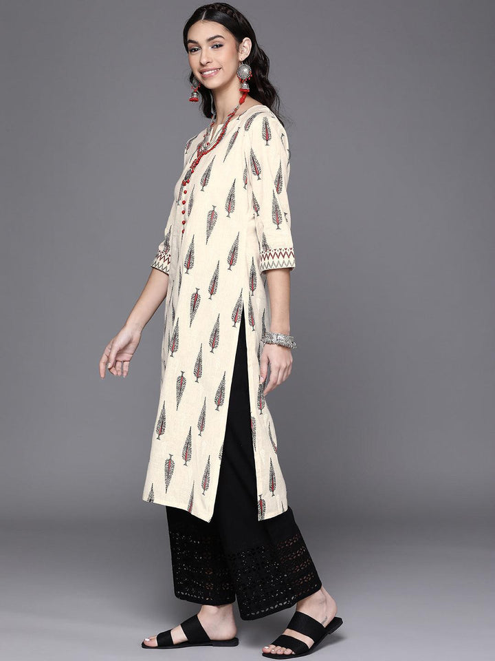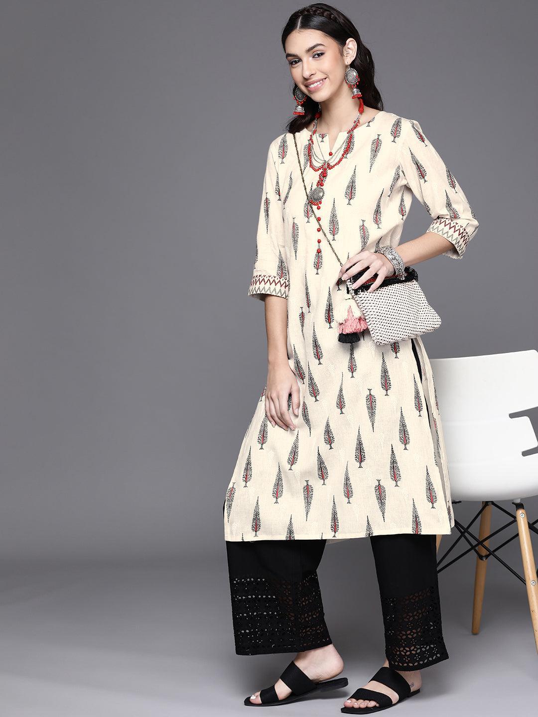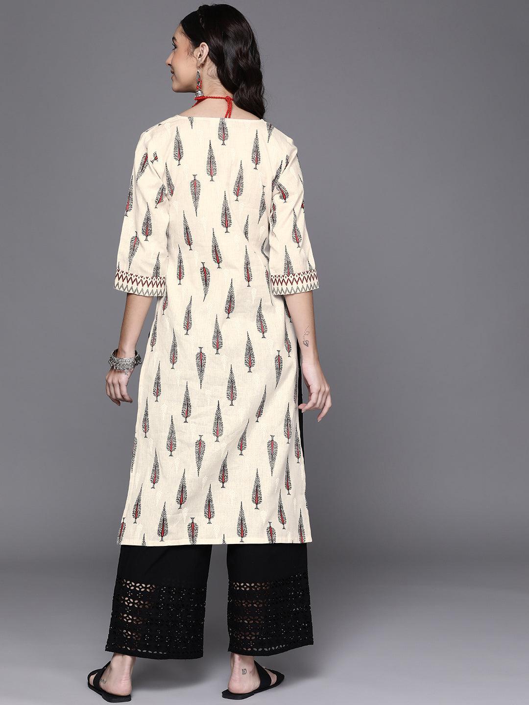 Our off-white straight-fit kurta cotton features ethnic motifs print, a motched neckline, and three-quarter regular sleeves. This elegant style is ideal for daytime festivities.