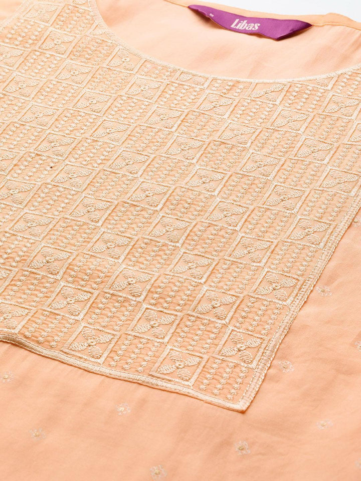 Peach Printed Silk Blend Straight Kurta With Trousers & Dupatta - Libas