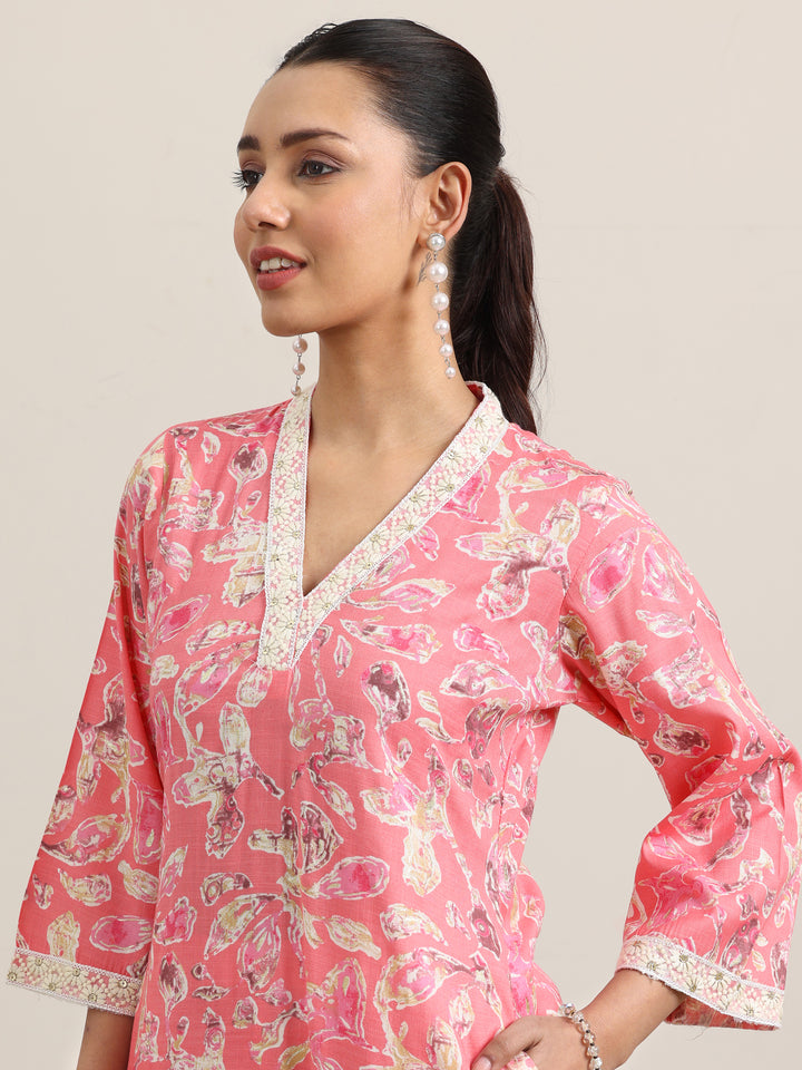 Our pink printed cotton blend straight kurta features a V-neckline and three-quarter flared sleeves. Highlighted with lace detailing and floral prints, this style is perfect for work and beyond.