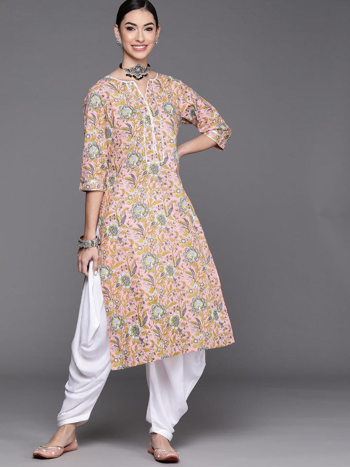 Our pink straight-fit floral print cotton kurta features a notched neckline with complementing fabric-trim and Gota Patti accents on the yoke and sleeves. This comfortable style is ideal for a shopping spree.