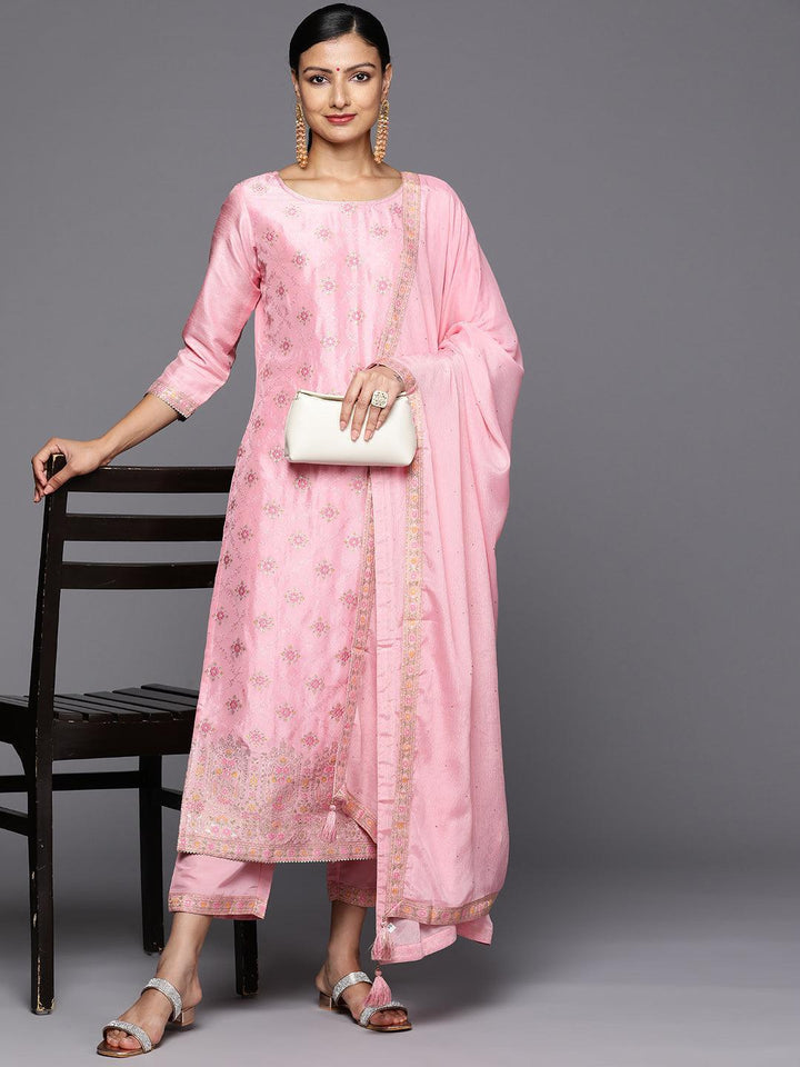Pink Woven Design Silk Blend Straight Kurta With Trousers & Dupatta - Libas