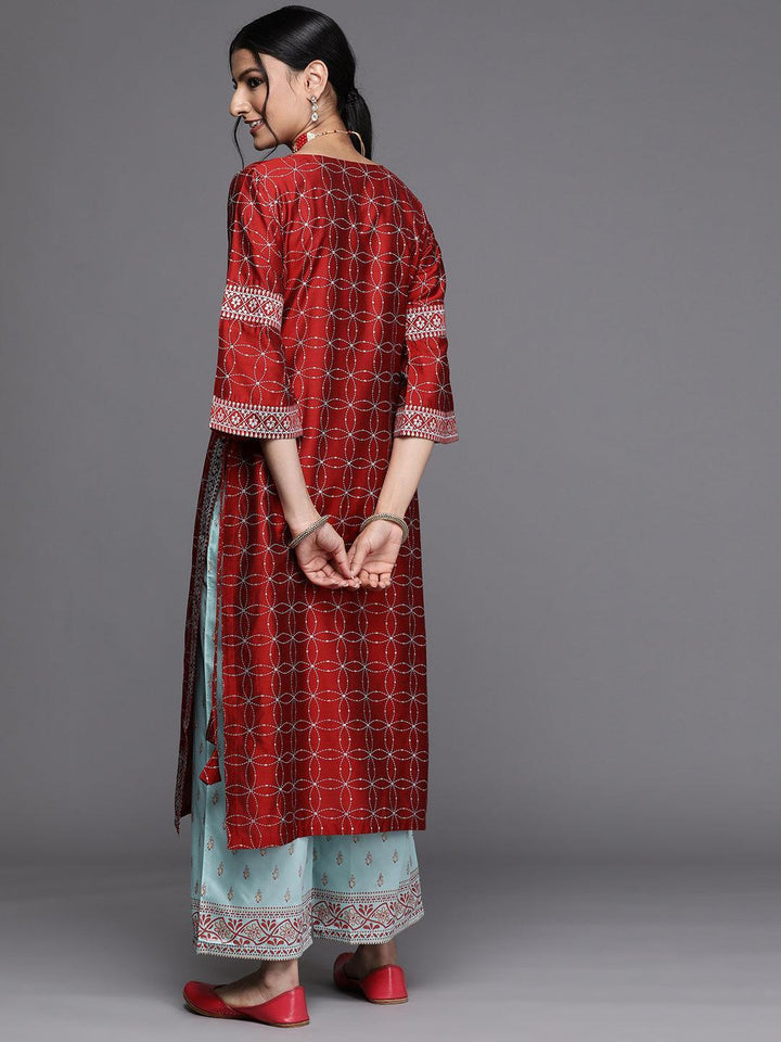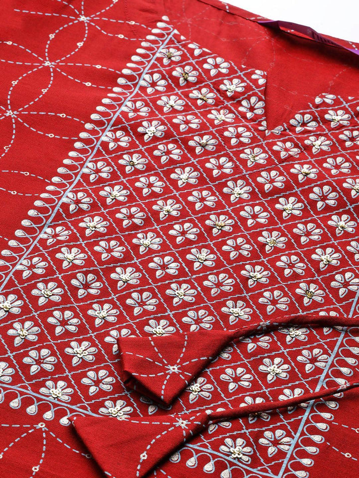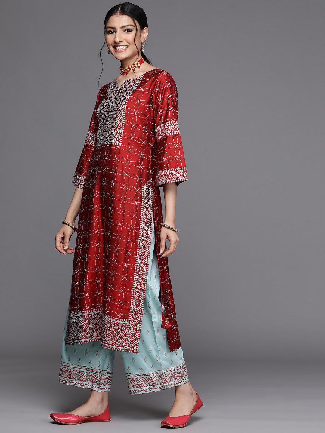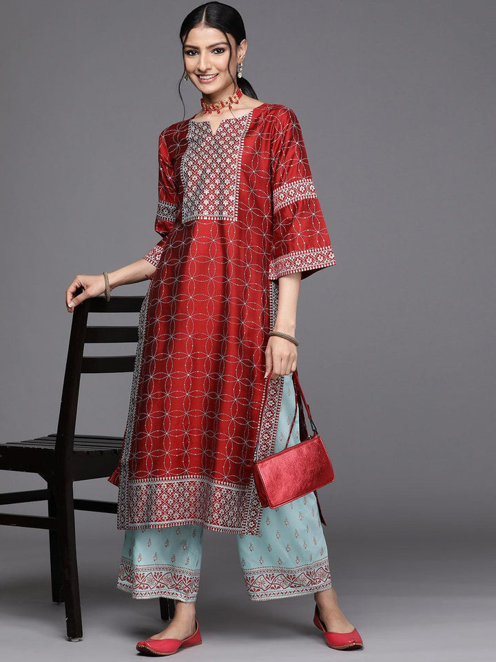 Our red and white Chanderi silk straight-fit kurta features ethnic motifs print, a notched neckline, Dori details, and three-quarter flared sleeves. This style is ideal for elevated everyday wear.
