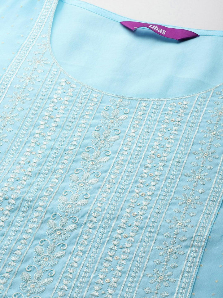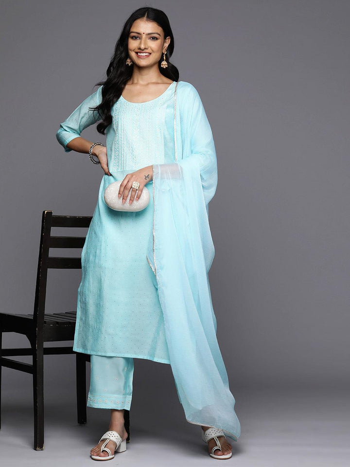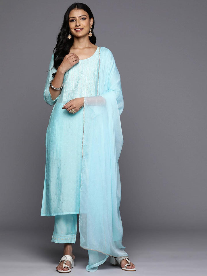 Our 3-piece turquoise blue silk blend suit set features a straight-fit kurta with a round neckline, three-quarter sleeves, and a statement yoke. Complemented with printed trousers with a partially elasticated waistband and roomy pockets, and a poly chiffon dupatta. Adorned with intricate thread work, sequins detailing, and Gota Patti, this style is perfect for casual outings.