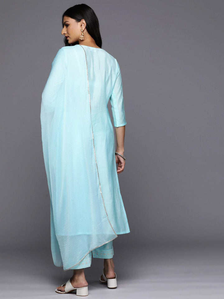 Turquoise Blue Printed Silk Blend Straight Kurta With Trousers & Dupatta - Libas