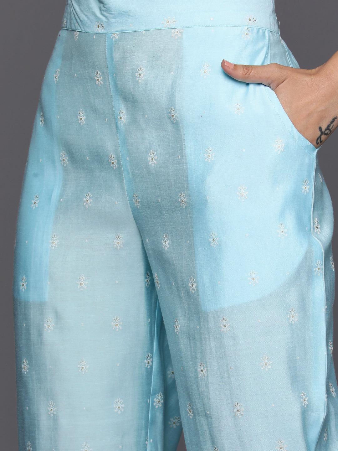 Turquoise Blue Printed Silk Blend Straight Kurta With Trousers & Dupatta