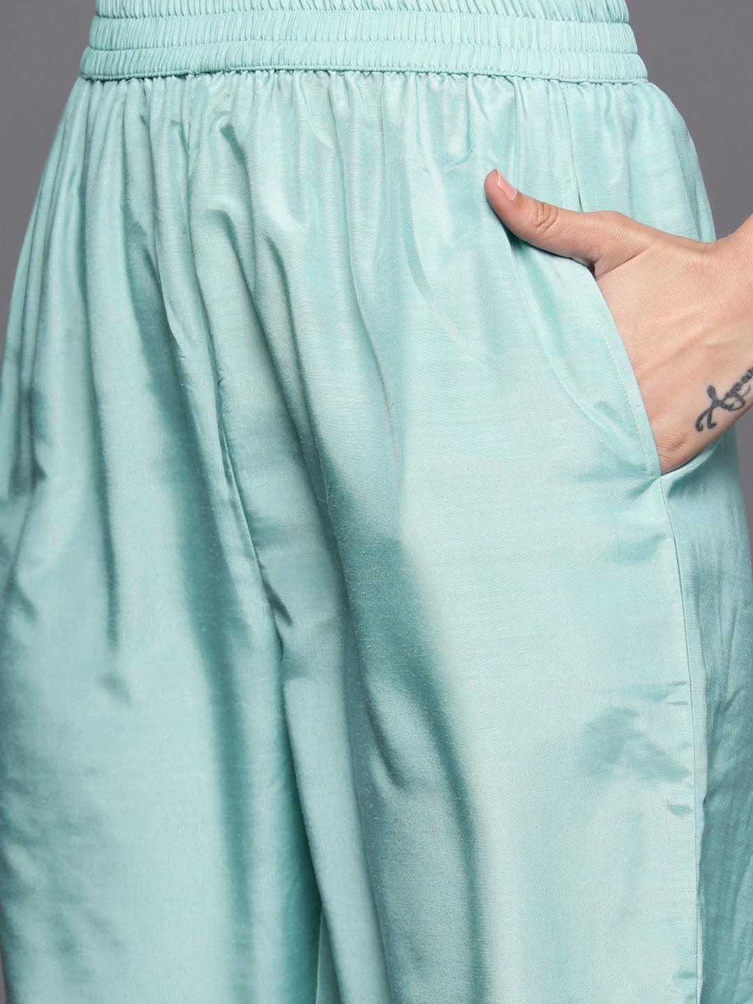 Turquoise Blue Self Design Rayon Straight Kurta With Trousers & Dupatta - Libas