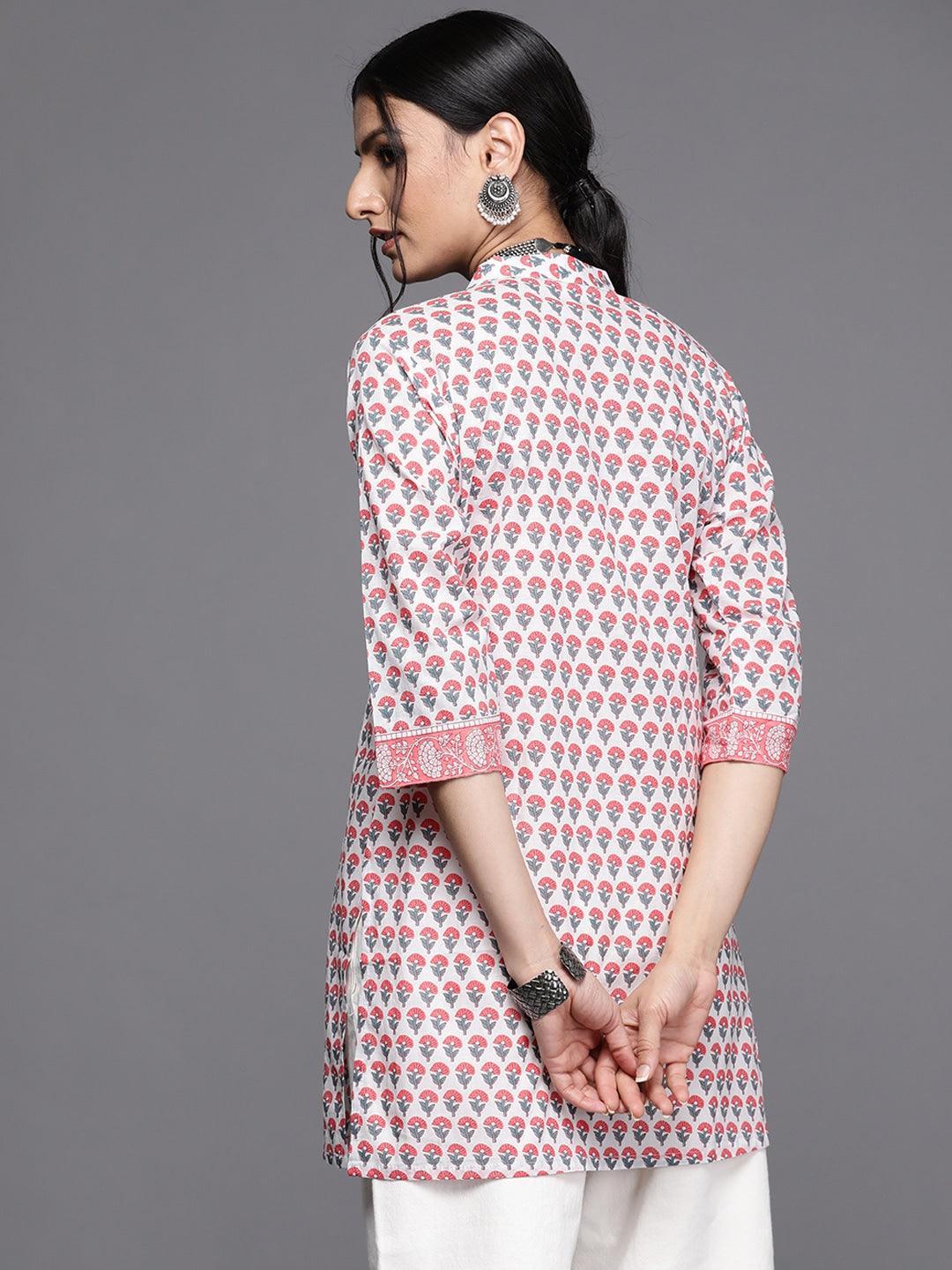 Our white and pink straight-fit short kurti features ethnic motifs print, a mandarin collar, and three-quarter regular sleeves. This graceful style is ideal for work and beyond.