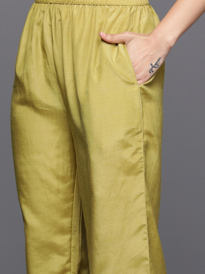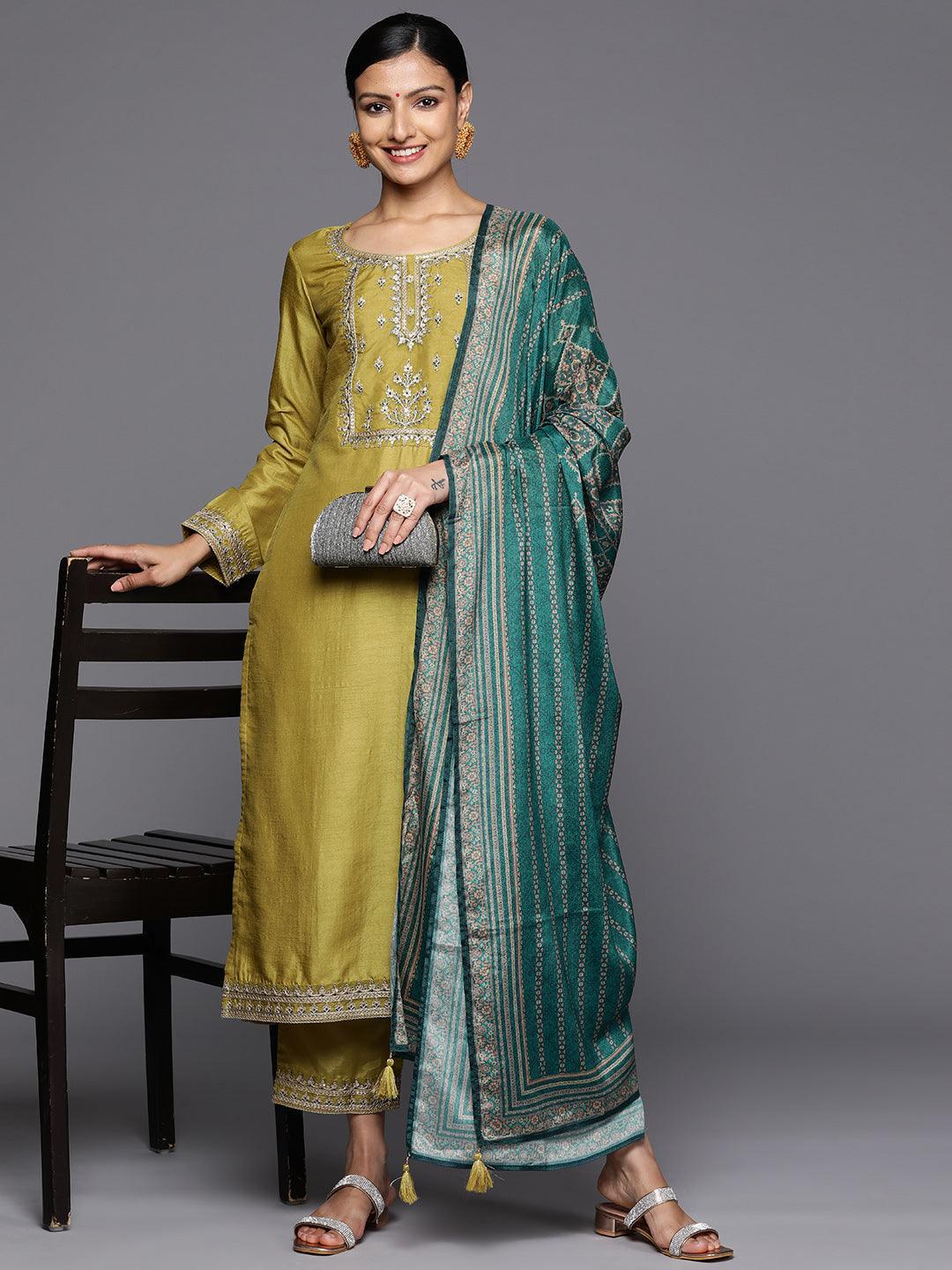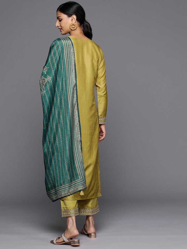 Yellow Printed Silk Blend Straight Kurta With Trousers & Dupatta - Libas