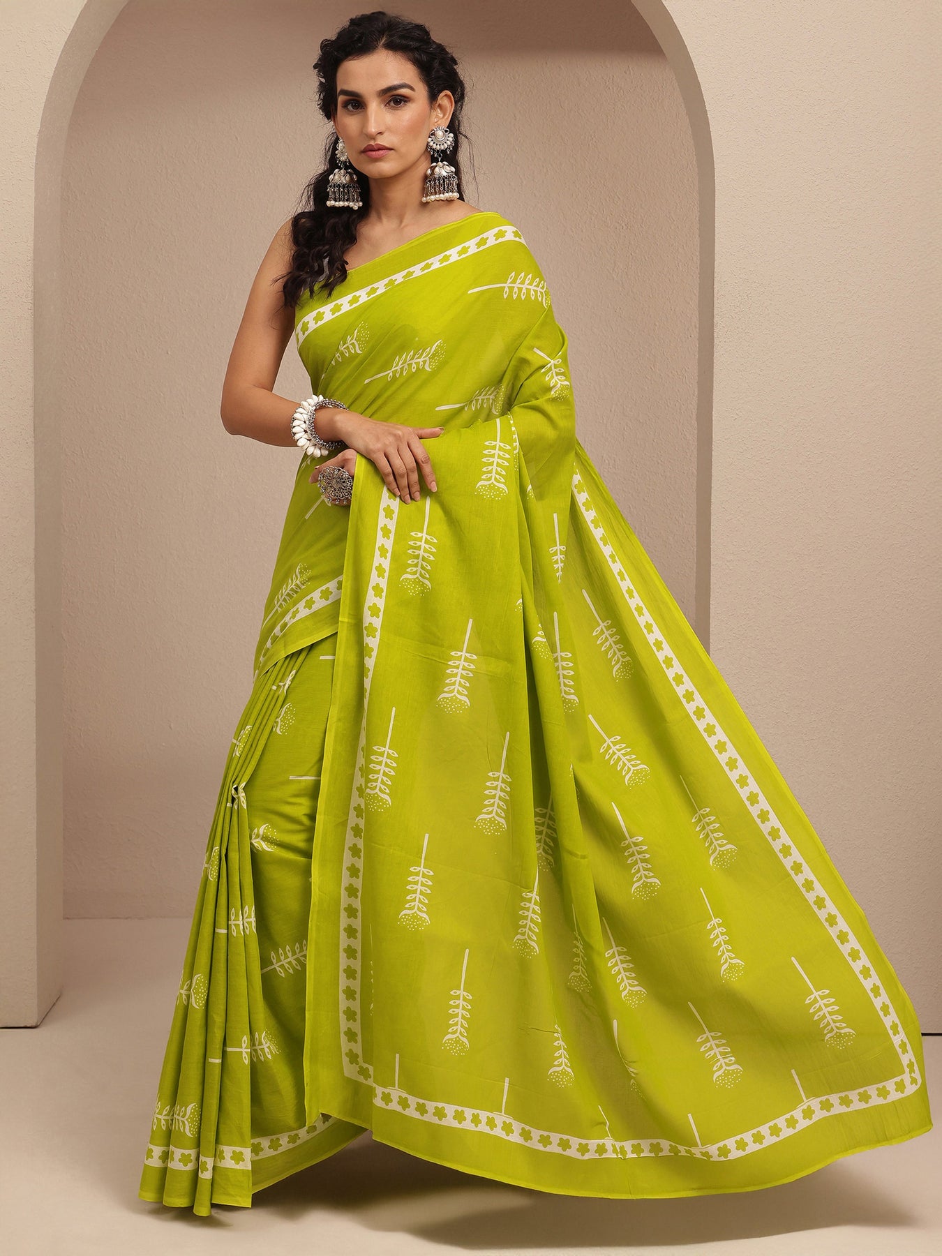 Our lime green printed cotton saree features captivating top pattern print. Complemented with an unstitched Blouse Piece. This charming saree is perfect for festive occasions