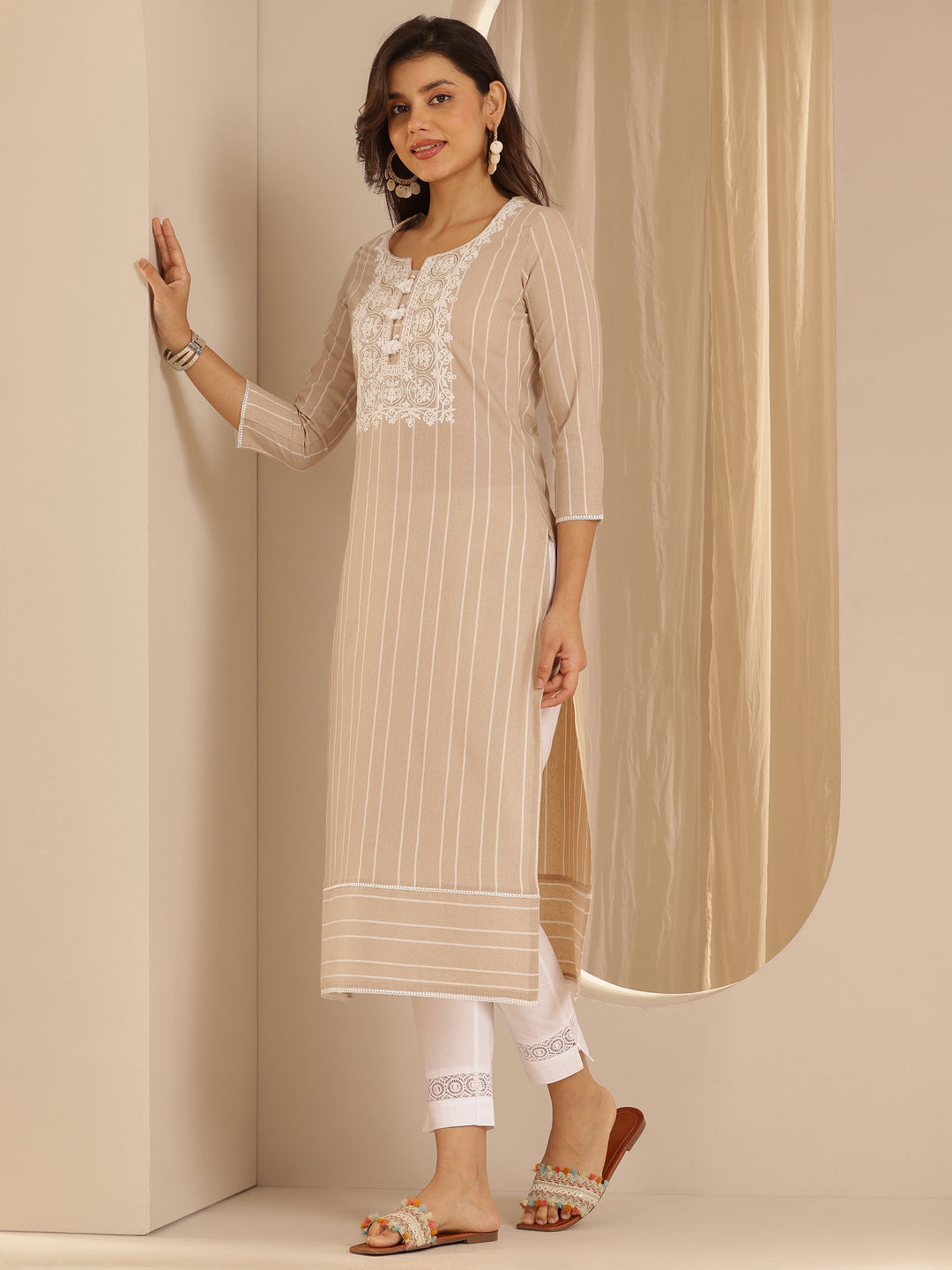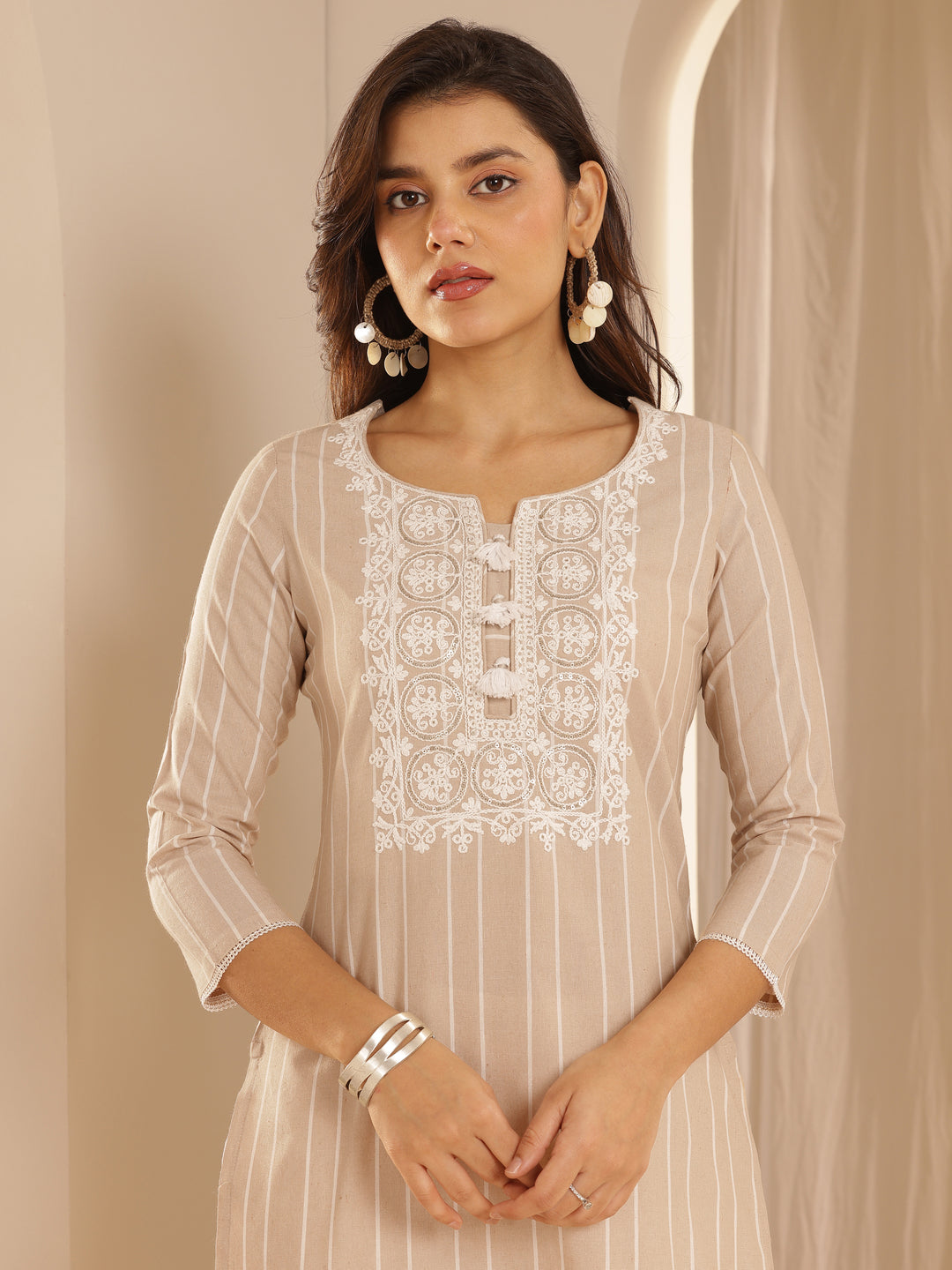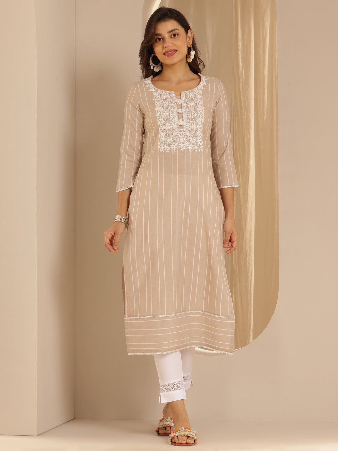 Beige Embroidered Cotton Blend Straight Kurta
