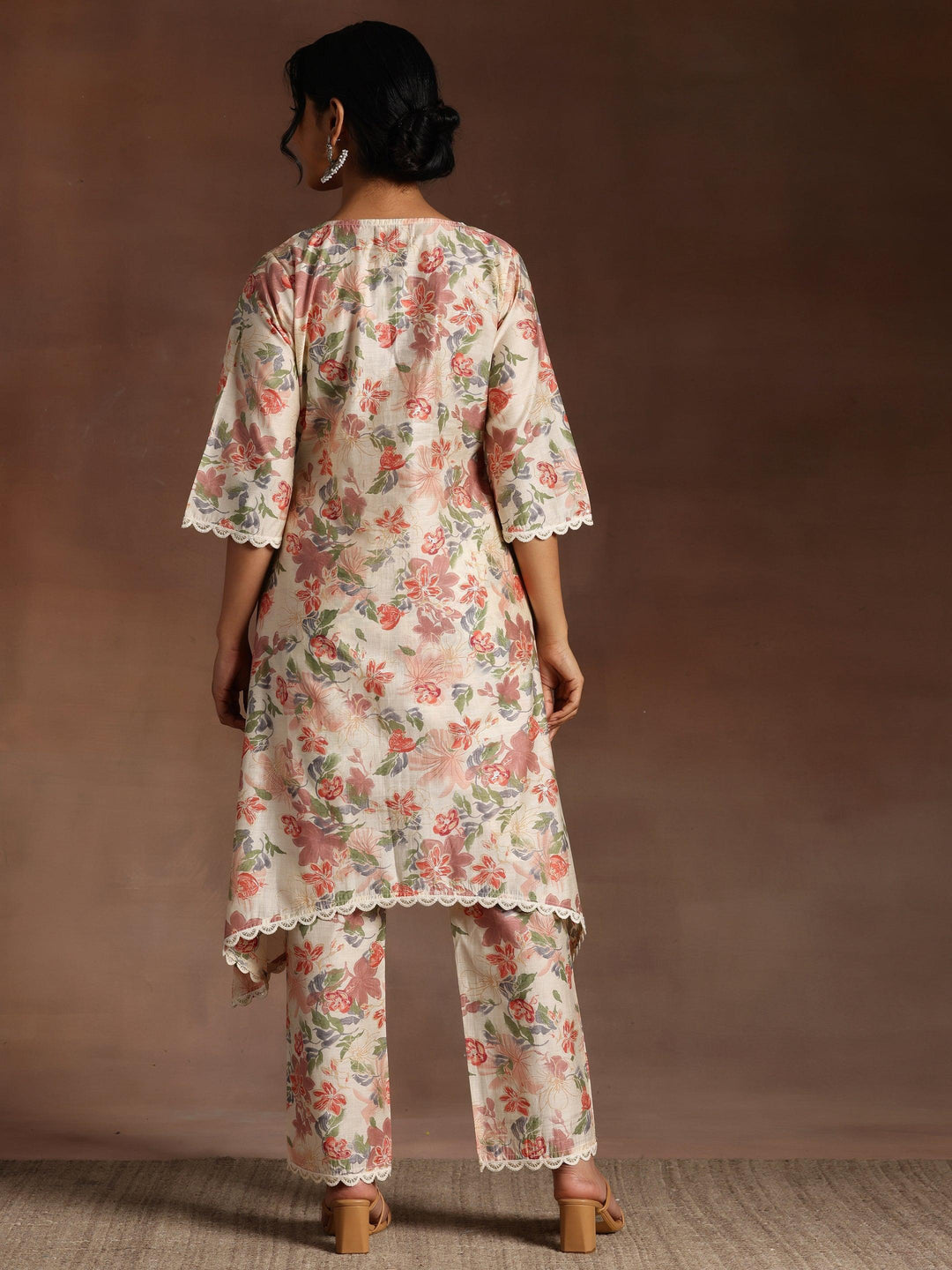 Our 2-piece beige printed kurta set features an A-line kurta with a V-neckline, three-quarter flared sleeves, and a high-low hemline. Complemented with trousers with a partially elasticated waistband and roomy pockets. Adorned with captivating floral prints and lace detailing, this style is perfect for casual outings.