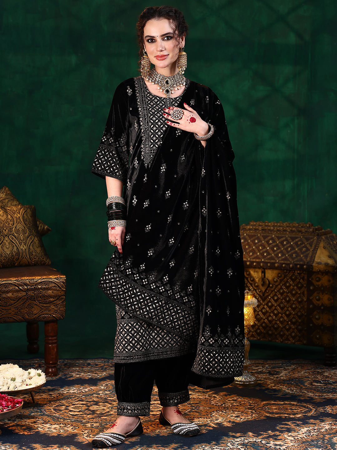Our 3-piece black embroidered velvet suit set features a straight-fit kurta with a round neckline, three-quarter flared sleeves, and a statement yoke. Complemented with Salwar trousers with a partially elasticated waistband and roomy pockets, and a dupatta. Adorned with intricate thread work and sequins, this style is perfect for festive celebrations.