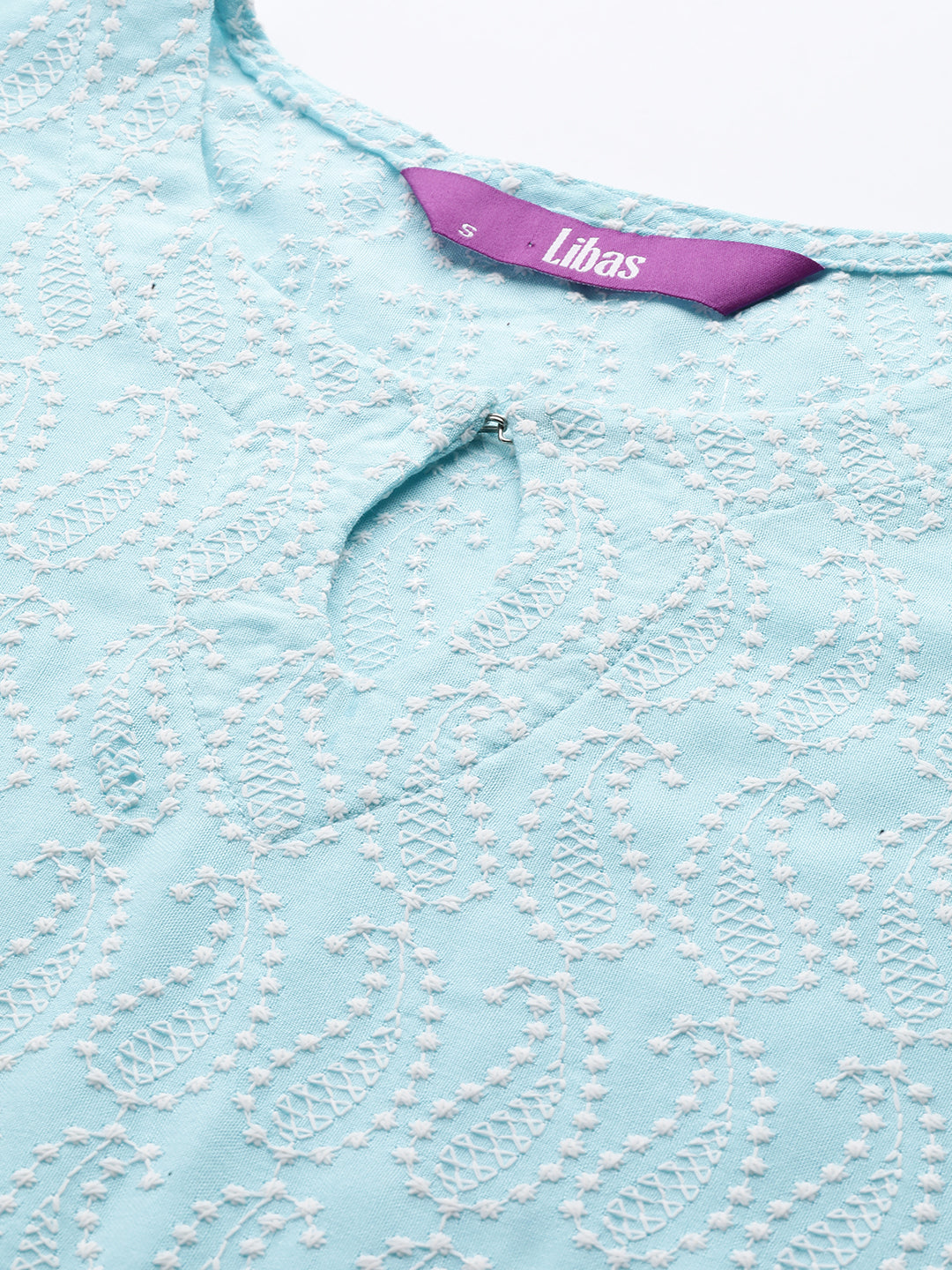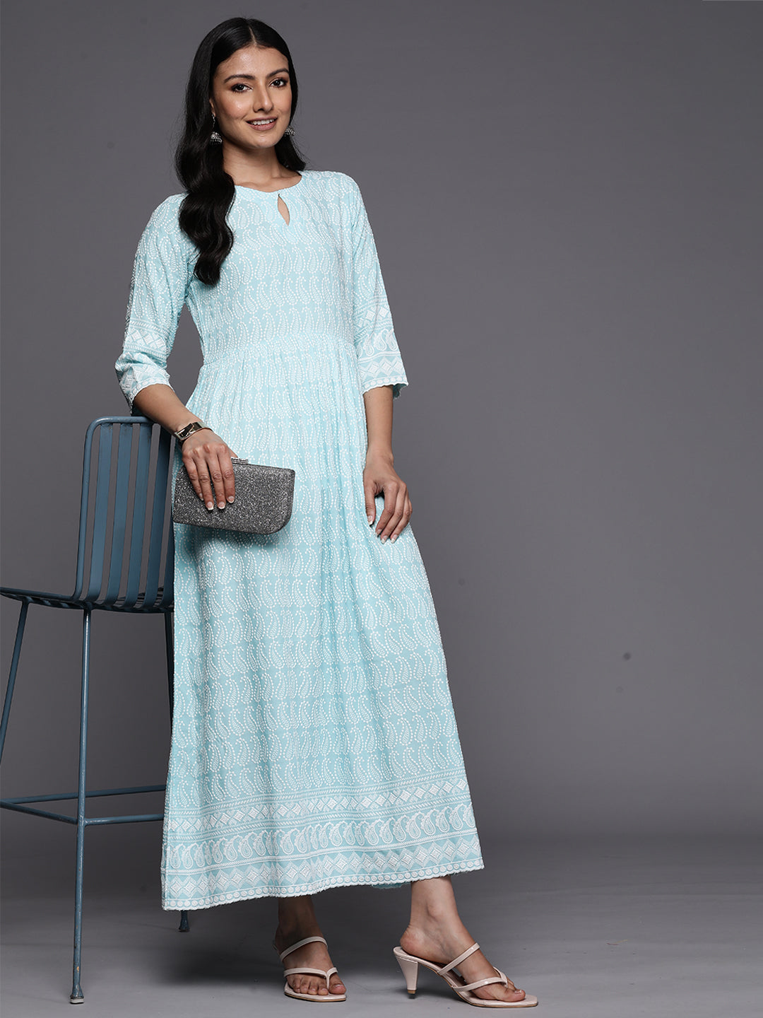 Our blue paisley embroidered fit and flare dress, crafted in breezy rayon fabric features a keyhole neckline, three-quarter sleeves, roomy pockets, and a flared hemline. This comfortable style is ideal for casual outings.