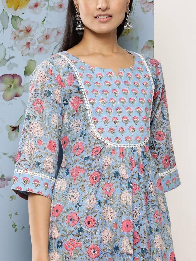Our blue floral print midi cotton dress features a notched neckline, three-quarter flared sleeves and a flared hemline. Adorned with delicate lace and fabric-trim accents, this comfortable style is perfect for elevated everyday wear.