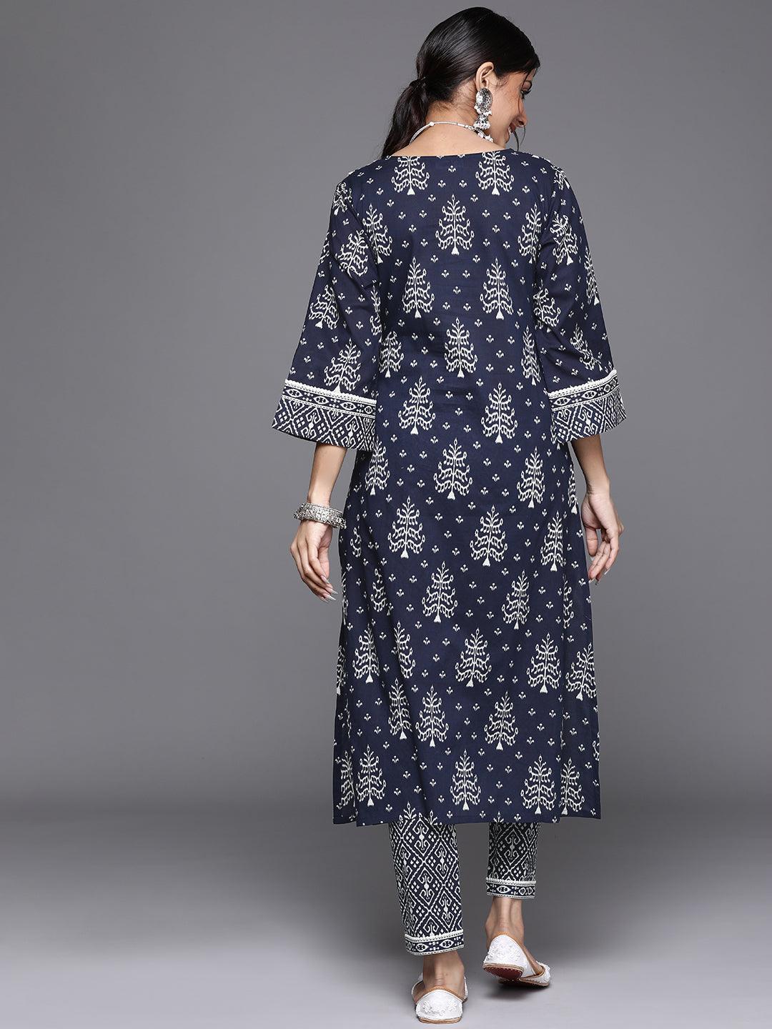 Our blue straight-fit printed cotton kurta features a curved V-neckline kurta and three-quarter flared sleeves. Adorned with complementing fabric and lace-trim accents, this versatile style is ideal for elevated everyday wear.