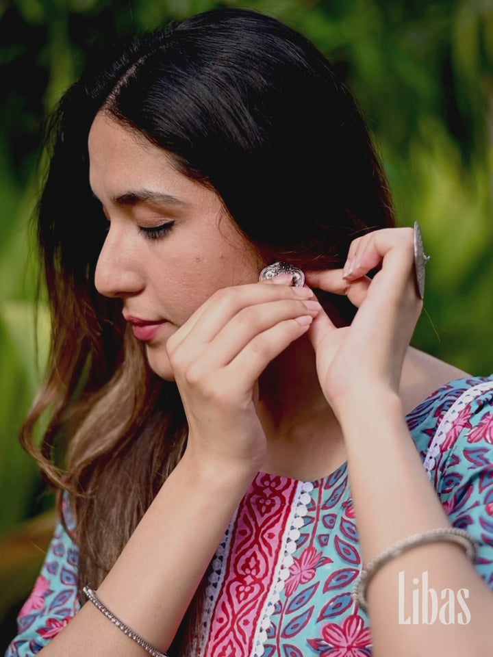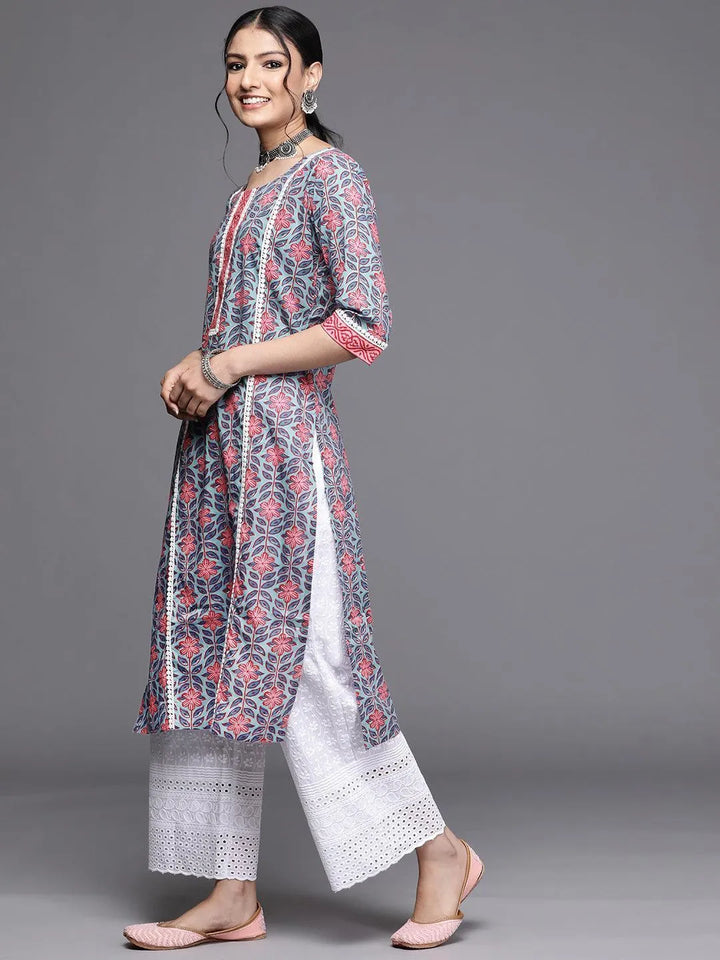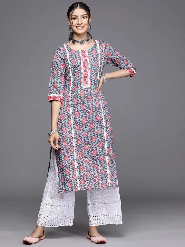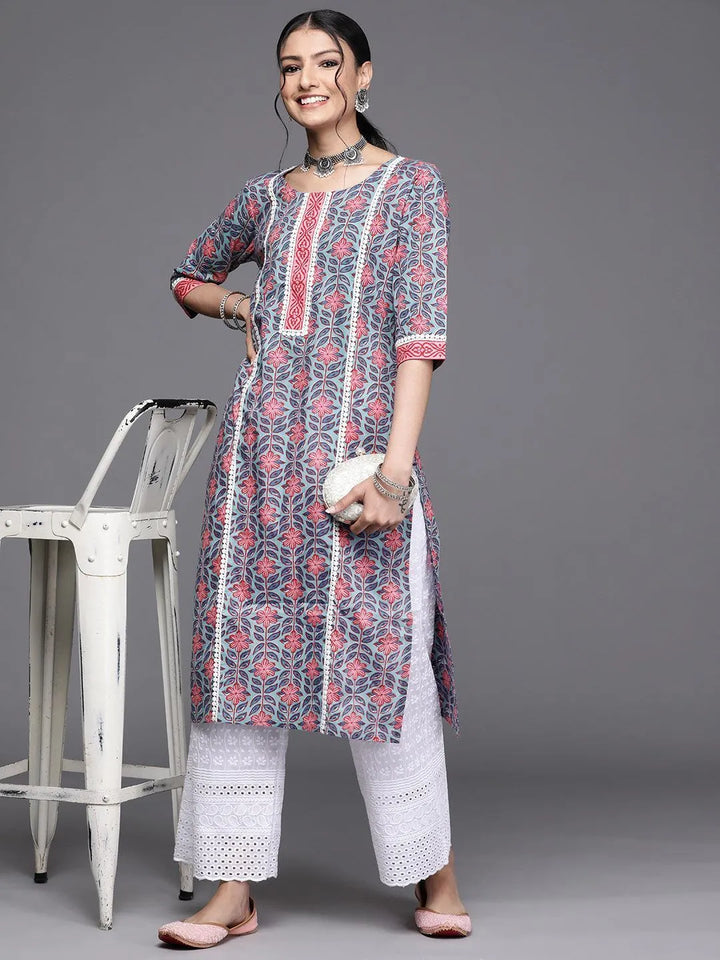 Our blue floral print straight-fit kurta, crafted in cotton fabric, features a round neckline and three-quarter sleeves. Adorned with lace detailing and fabric trim accents, this style is perfect for elevated everyday wear.