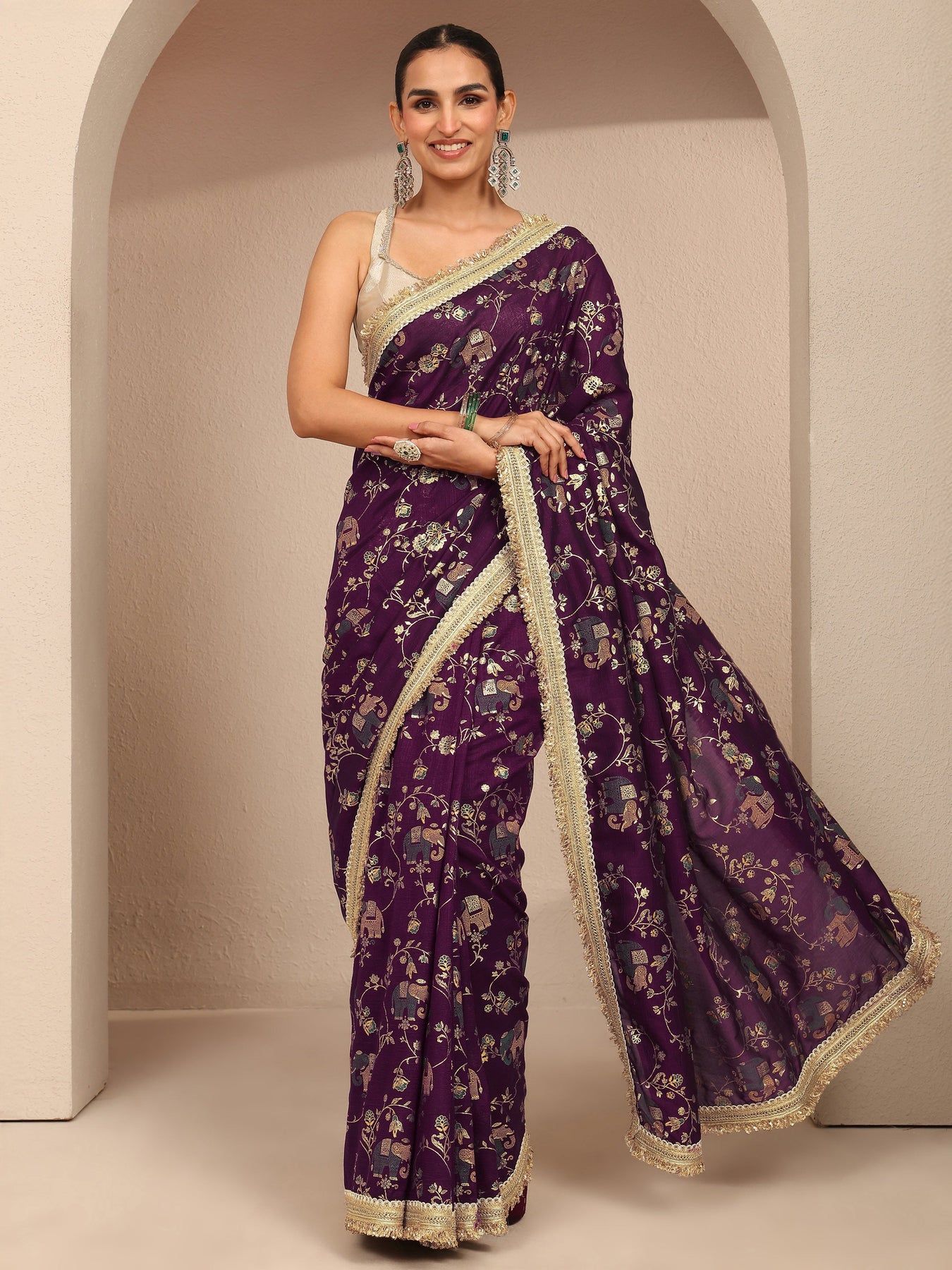 Our purple silk blend saree features captivating embellishments. Complemented with an unstitched blouse piece. This charming saree is perfect for festive occasions.
