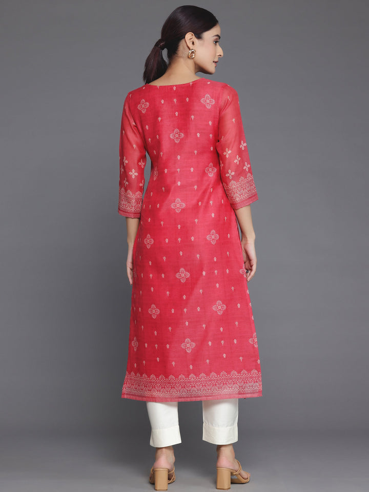 Our coral embellished Chanderi silk straight-fit kurta features a round neckline, three-quarter sleeves, and a statement yoke. Elevated with ethnic motifs print, mirror work, and sequins accents, this style is ideal for light festivities.