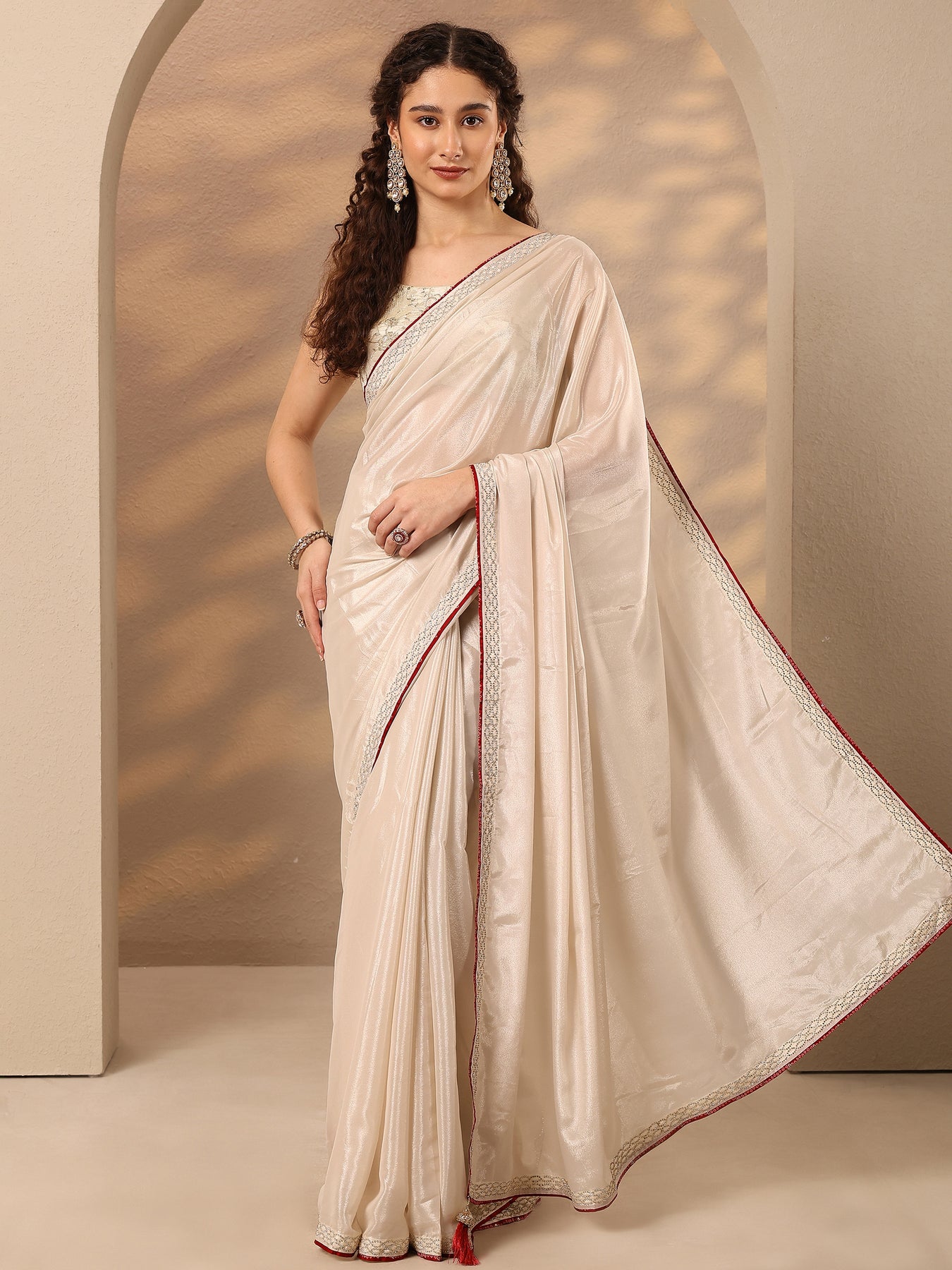 Our Cream Solid Sarees Silk Blend Saree Features Captivating Solid. Complemented With An Unstitched Blouse Piece. This Charming Saree Is Perfect For Festive Occasions.