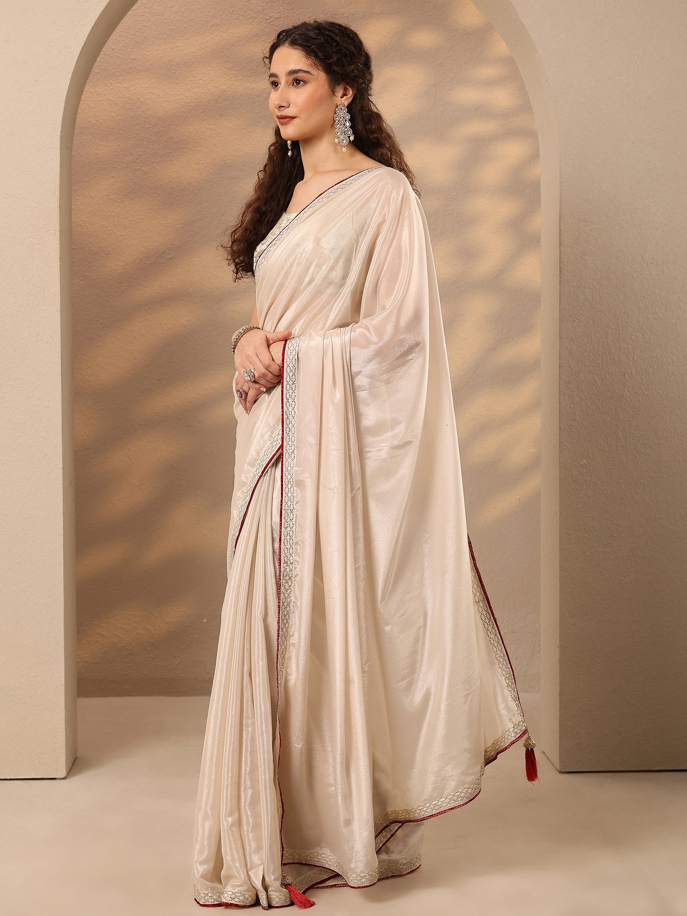 Cream Solid Silk Blend Saree With Unstitched Blouse Piece