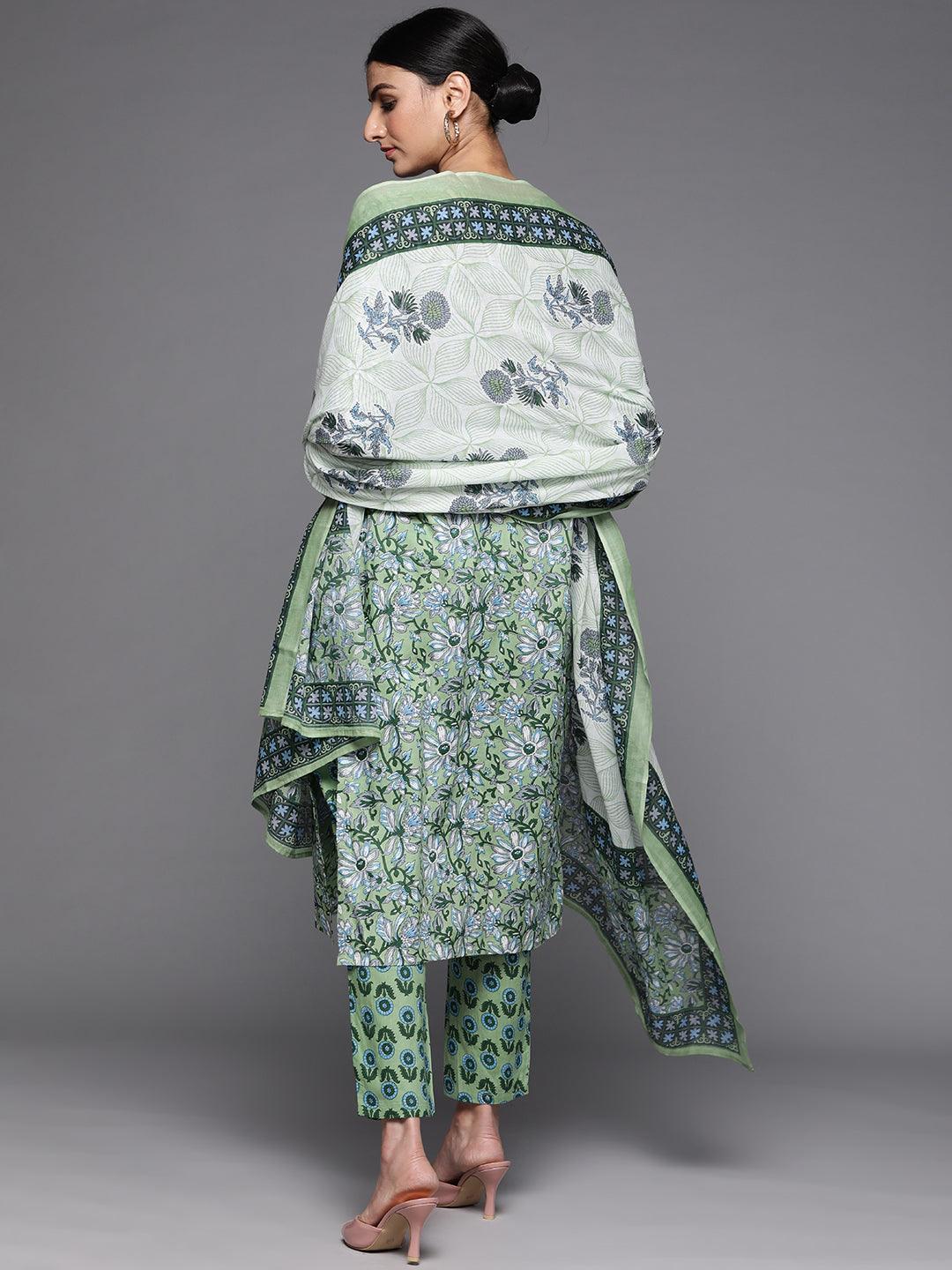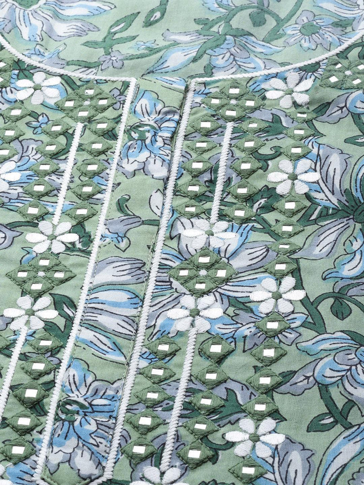 Our 3-piece green floral print cotton suit set features a straight-fit kurta with a round neckline and a statement yoke highlighted with intricate embroidery and mirror-work details, straight pants with a partially elasticated waistband and roomy pockets, and a dupatta in a contrasting print. Ideal for elevated everyday wear.