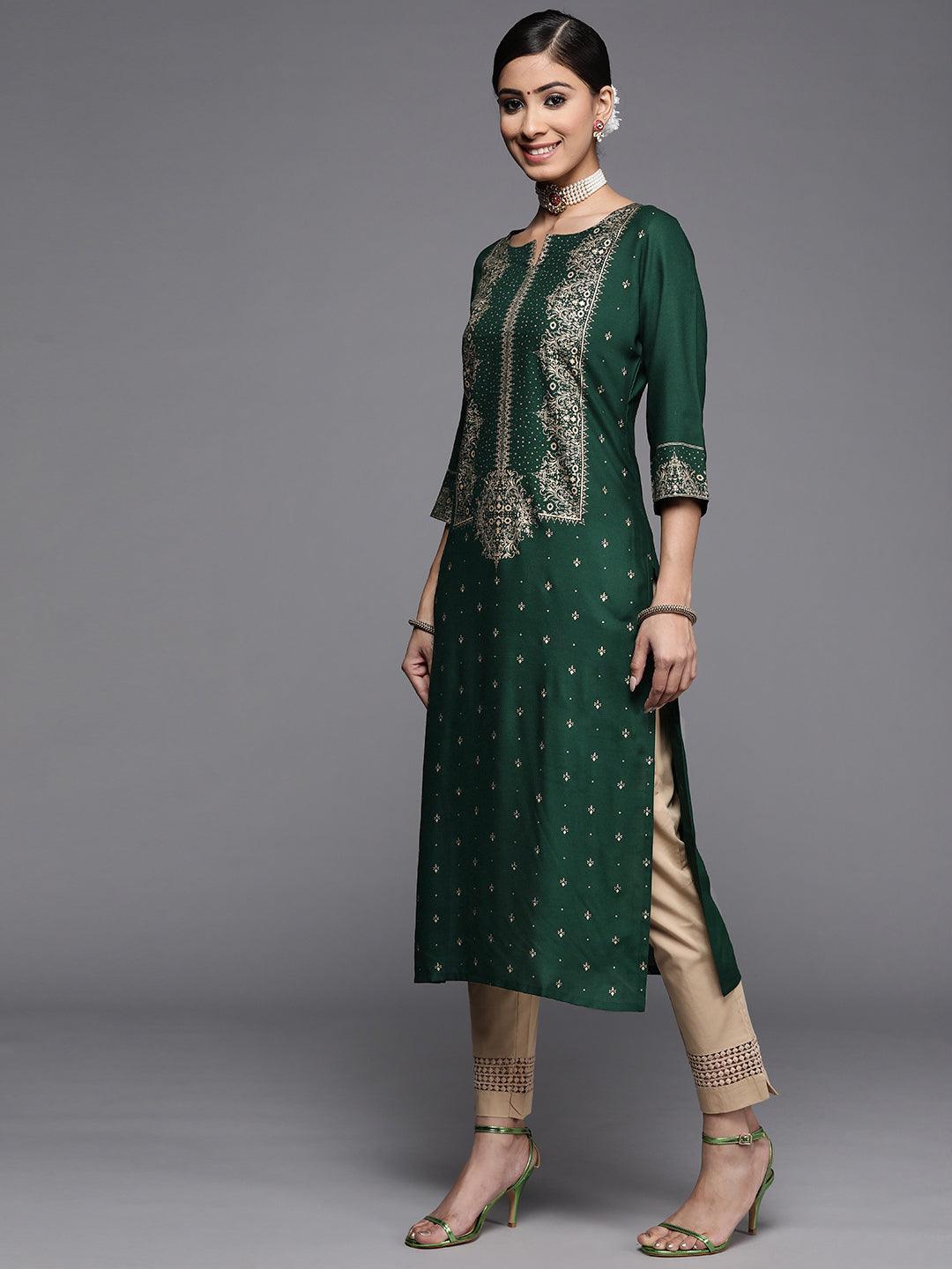 Our green and gold-toned straight-fit rayon kurta features a notched neckline and three-quarter sleeves. Adorned with a statement yoke, this charming style is ideal for festivities.