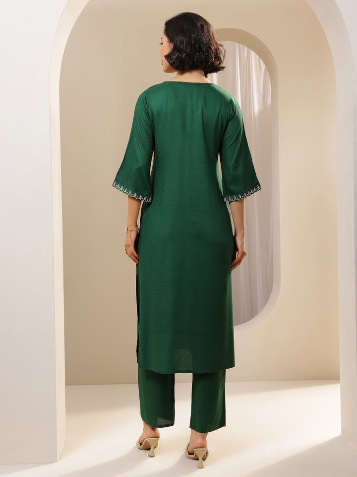Our 2-piece Green Viscose Rayon Straight-fit features a V-neckline, Bell Sleeves, and statement Yoke. Complemented with Straight Pants with a partially elasticated waistband. Adorned with Solid, this style is perfect for Casual.