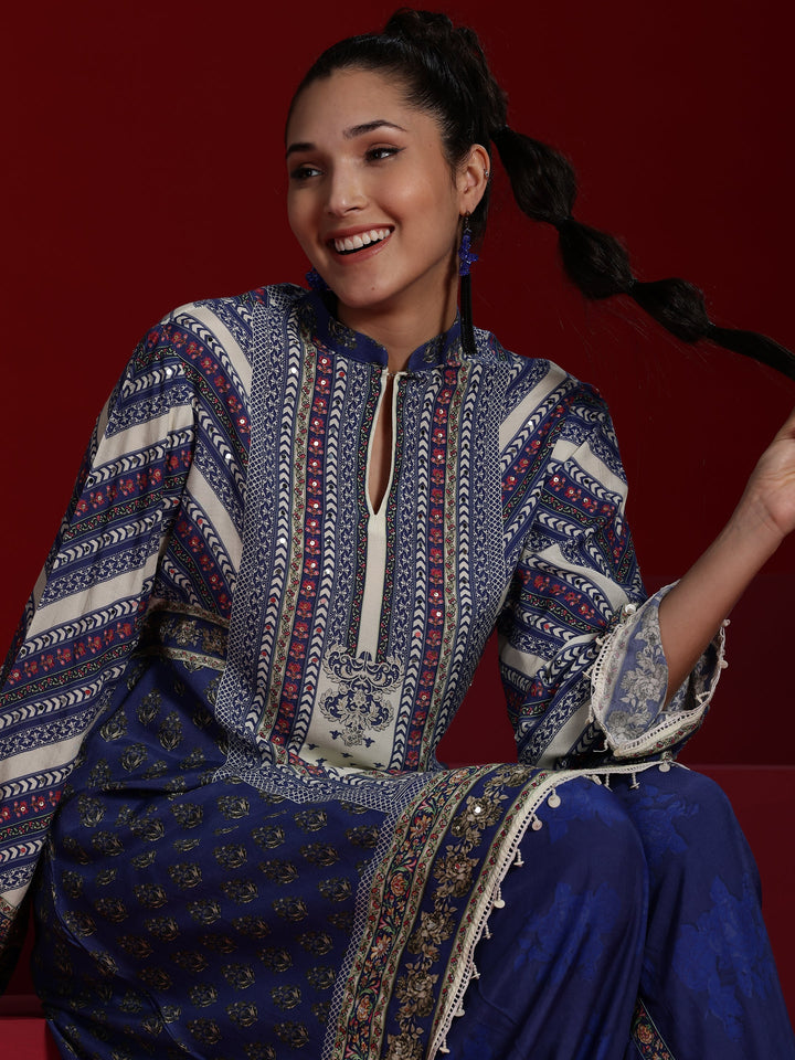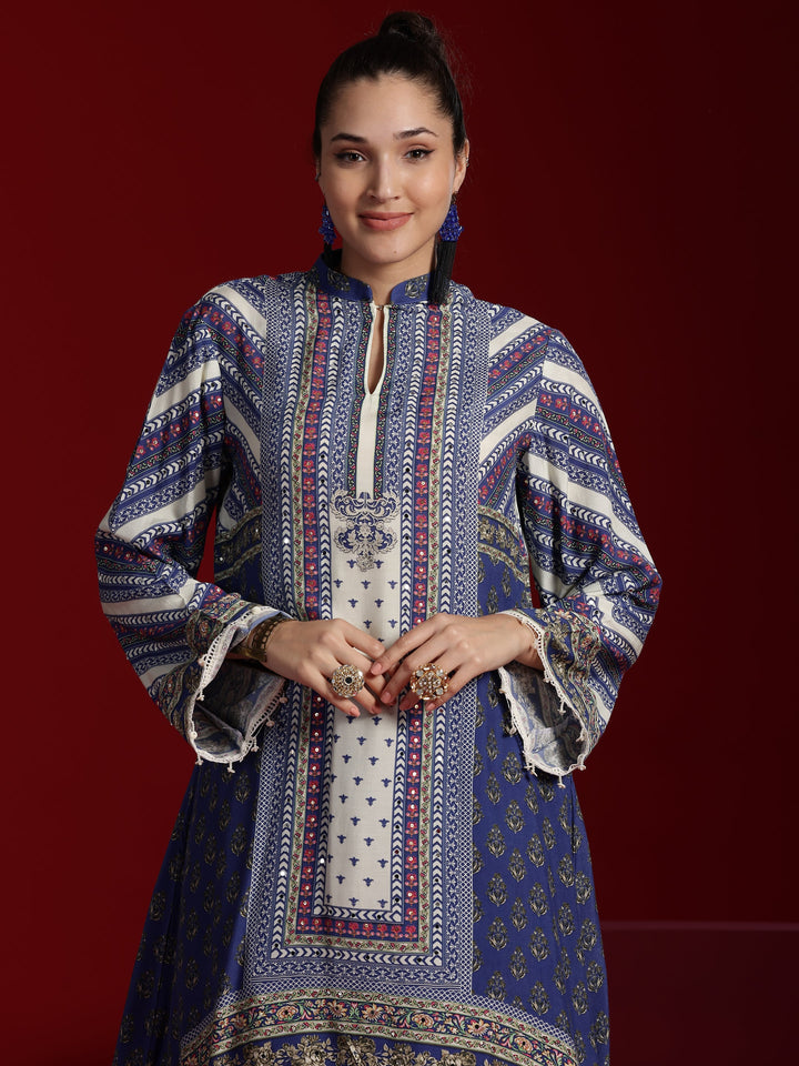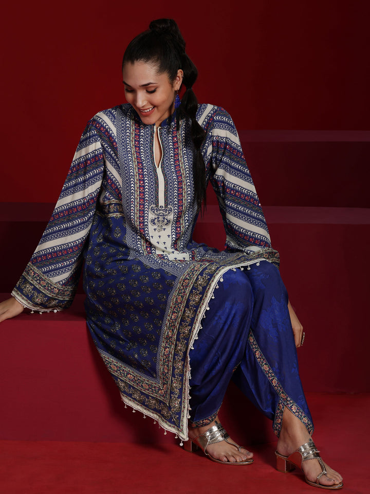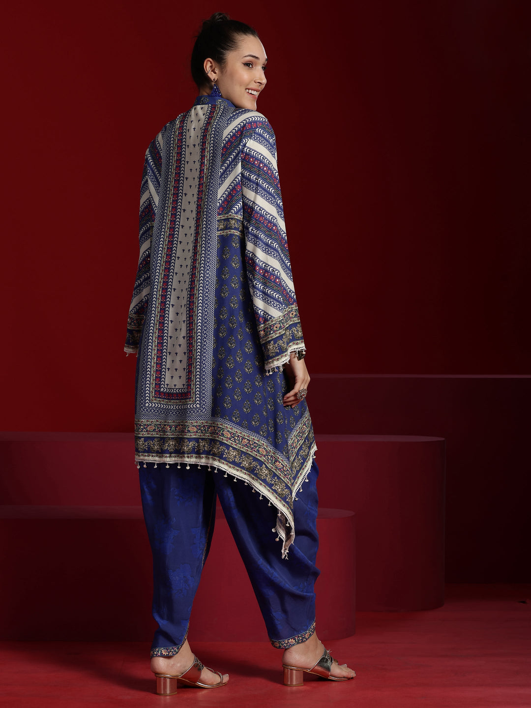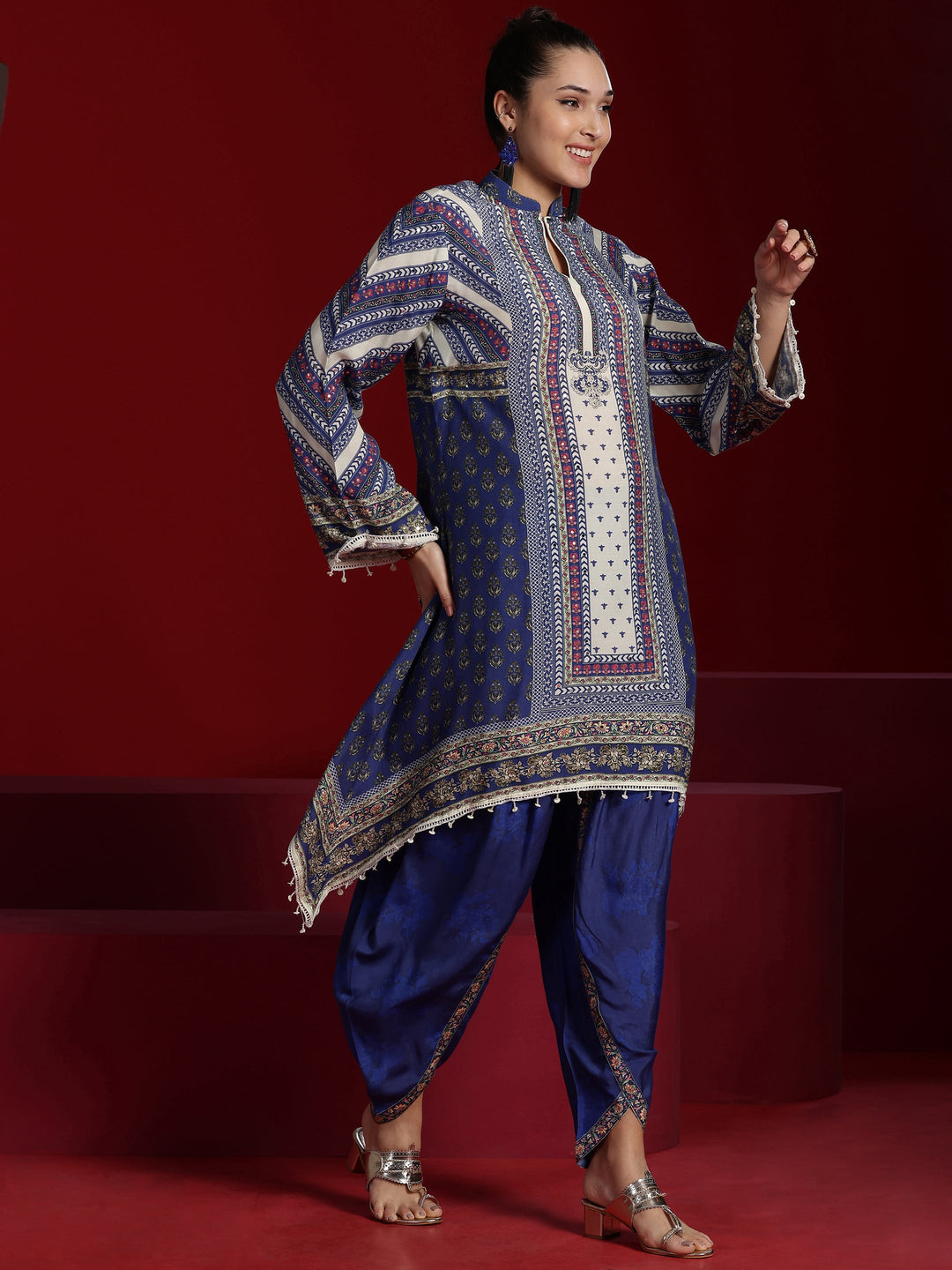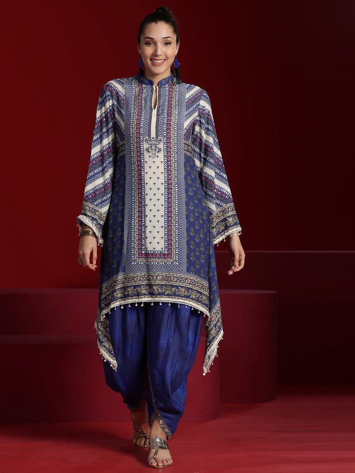 Libas Art Blue Printed Silk Blend Straight Kurta With Dhoti Pants