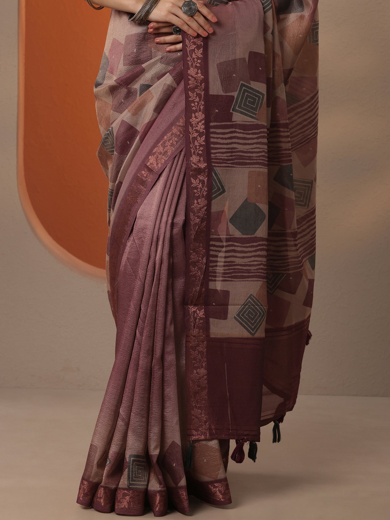 Mauve Printed Chinon Saree With Unstitched Blouse Piece