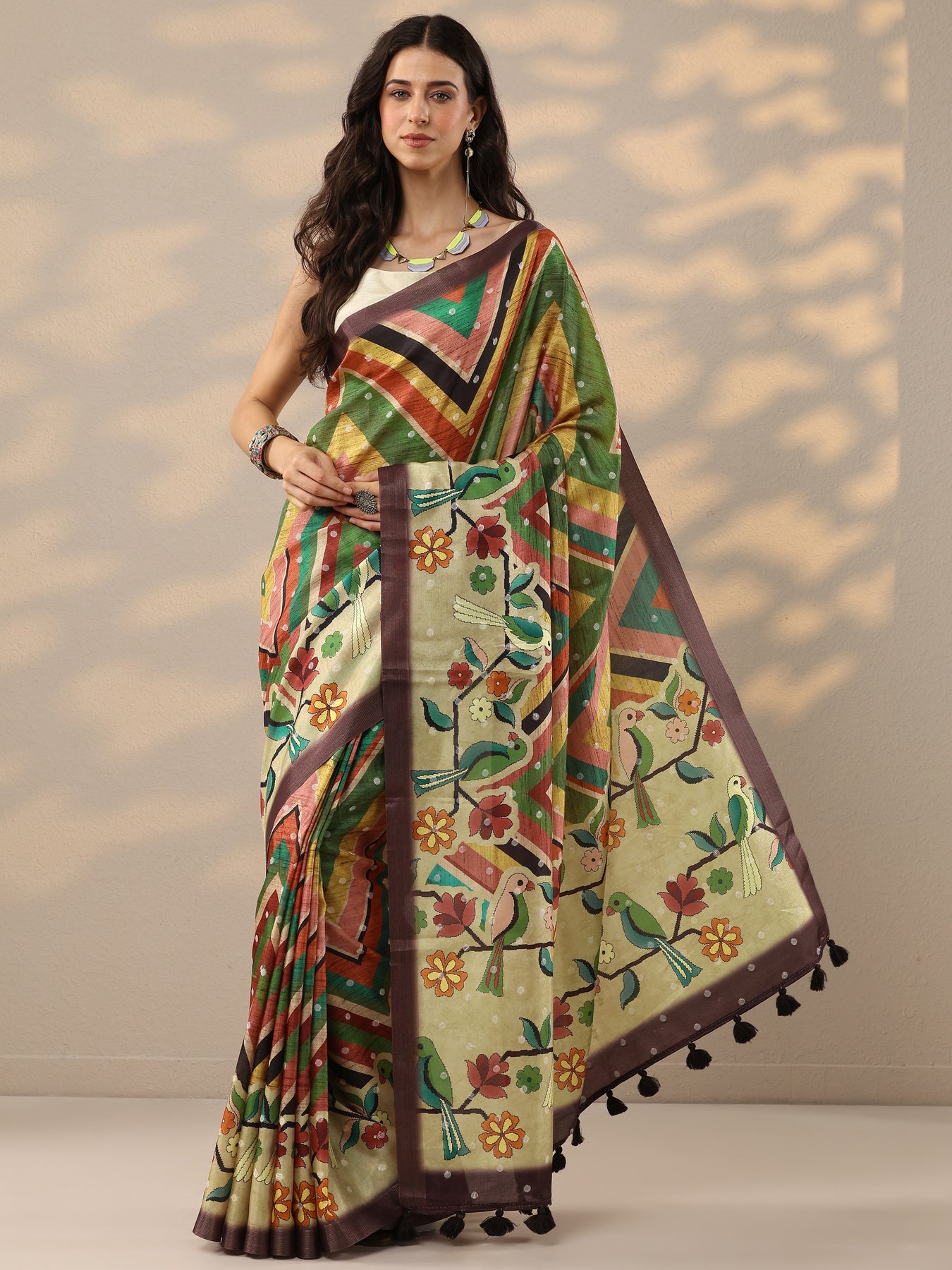 Multi Printed Silk Blend Saree With Unstitched Blouse Piece