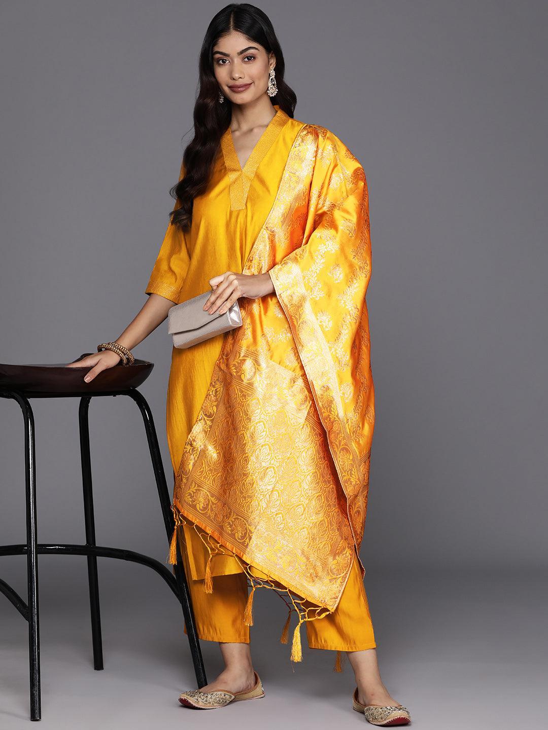 Our 3-piece mustard yellow silk blend suit set features a straight-fit kurta with a V-neckline and three-quarter sleeves. Complemented with trousers with a partially elasticated waistband and roomy pockets, and a brocade dupatta. Elevated with fringes and thread work, this style is perfect for casual outings.