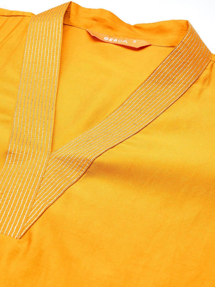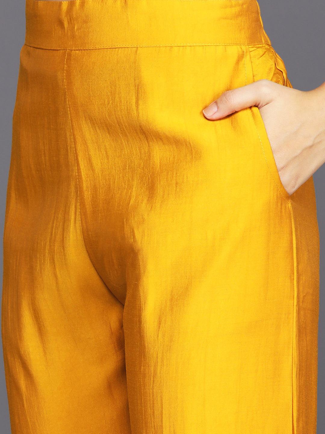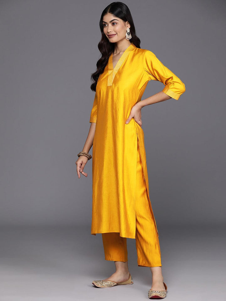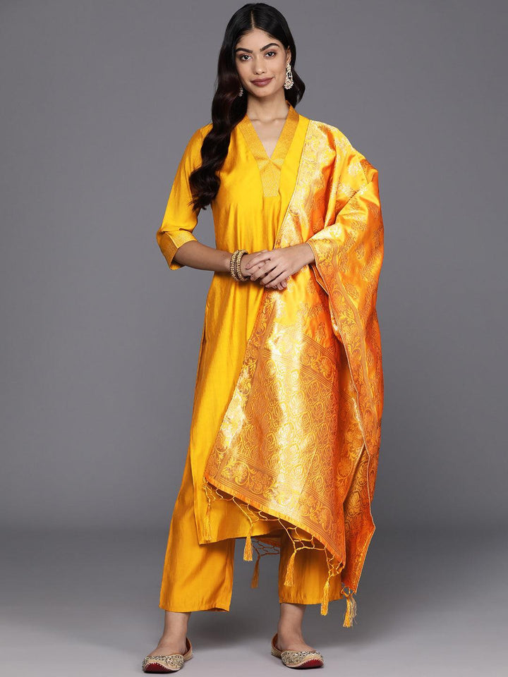 Mustard Solid Silk Blend Straight Kurta With Trousers & Dupatta - Libas